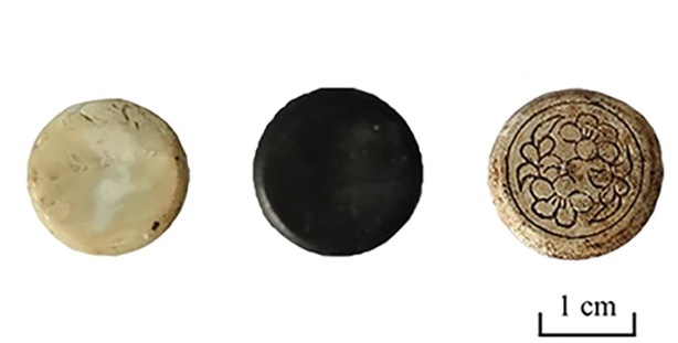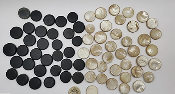 Белые камни оказались вырезанными из раковин: их поверхность сохранила слоистую перламутровую структуру и была тщательно отполирована вручную. Черные фишки изготовлены из глины, обожженной в бескислородной среде: дым насыщал материал углеродом, создавая прочный и устойчивый темный слой. На двух камнях с резным узором найдены следы экстремально высоких температур, необходимых для сохранения формы при обжиге.