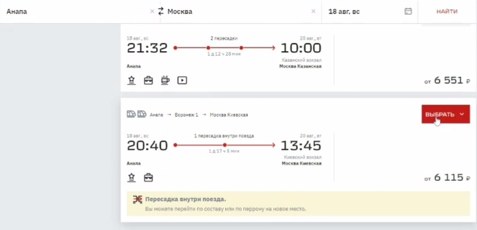 Варианты с пересадкой по одному маршруту отмечаются специальным предупреждением «Пересадка внутри поезда». При оформлении такой опции пассажир получит несколько билетов, отдельных для каждого места. На каждую часть поездки проводники будут регистрировать пассажира отдельно.