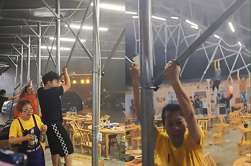 Сотрудники и клиенты ресторана в китайской провинции Хубэй в буквальном смысле взлетели в воздух, пытаясь удержать навес во время сильной бури. Один из очевидцев поделился невероятными кадрами в соцсетях.