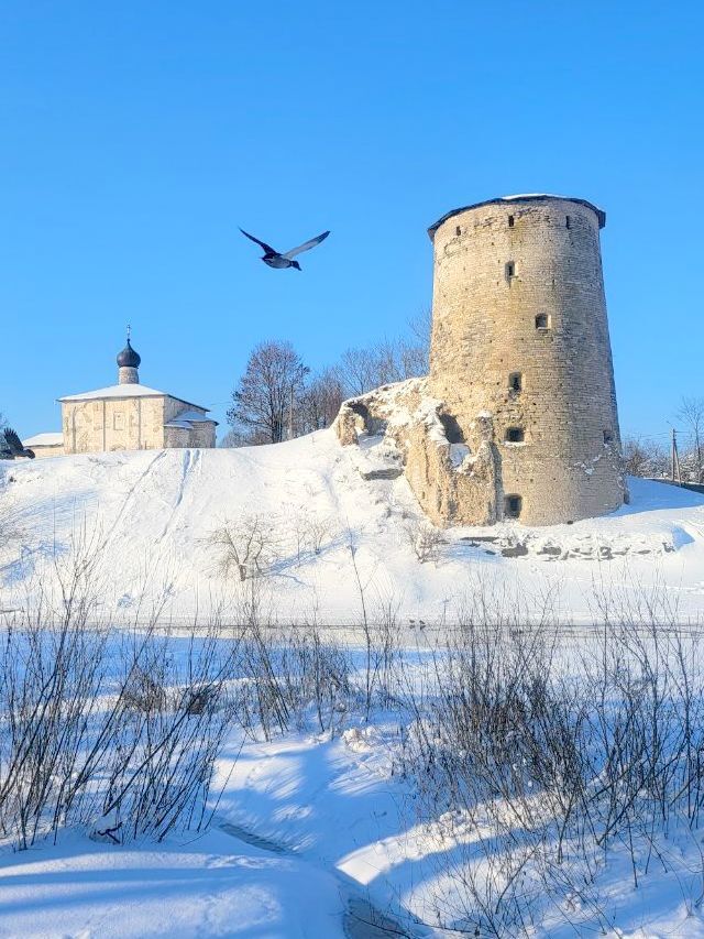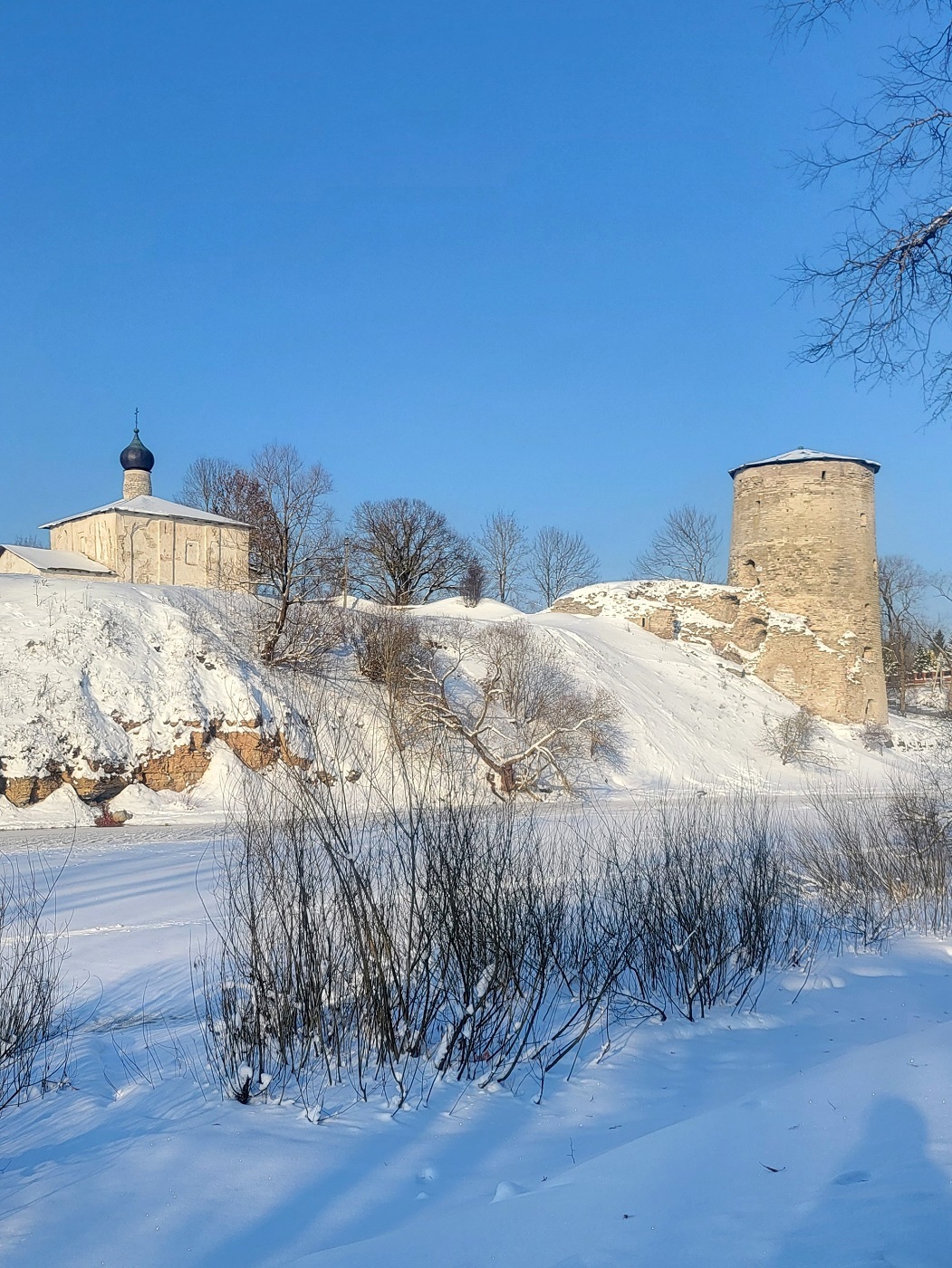 Тут я бывал неоднократно, но летом. На разных берегах Псковы стоят две башни. Высокая