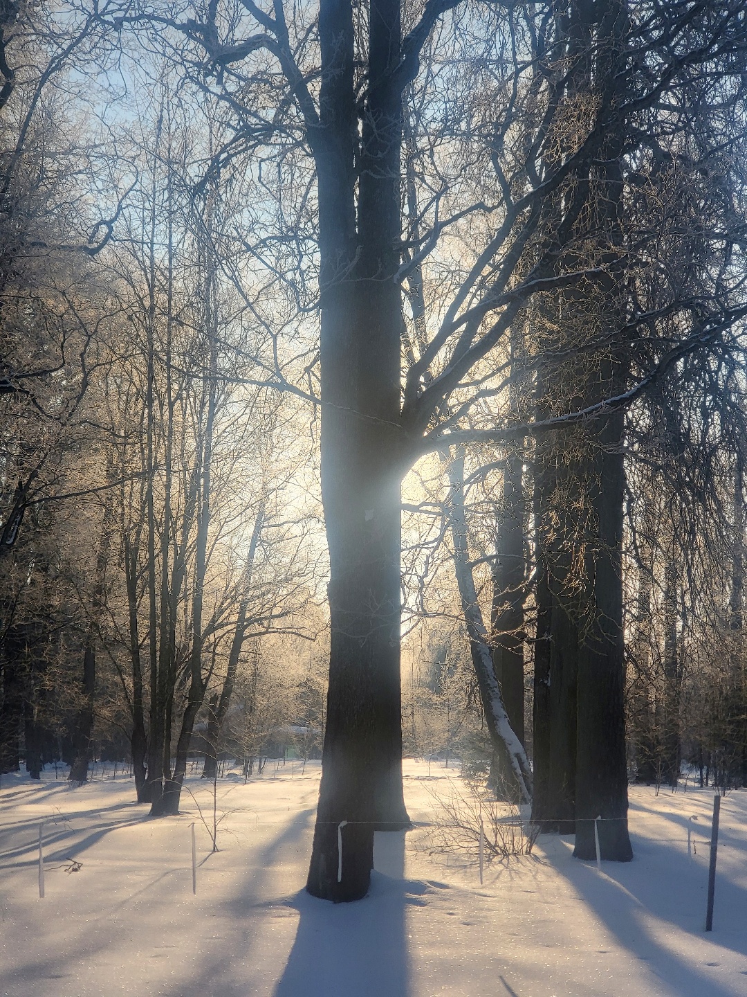 С утра, а все время стартую с ура, потому что я "жаворонок", залил полный бак и вперед. По пути заехал в Рождествено, на дачу Набокова. Но там меня ждало разочарование. Саму дачу и участок вокруг нее обнесли глухим забором. Не пройти, не погулять и не выйти на высокий берег Оредежи. Там красивый вид был. Но прогулялся по парку. И там я получил первые положительные эмоции. Солнце всходило. Снег скрипел под ногами. Тишина. Красота.