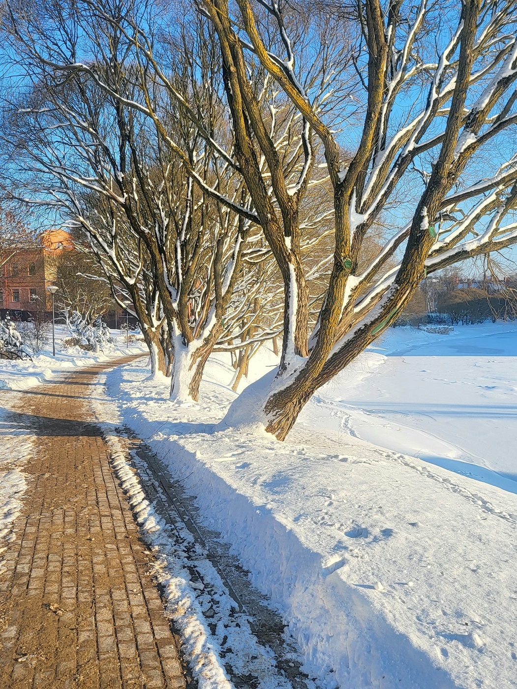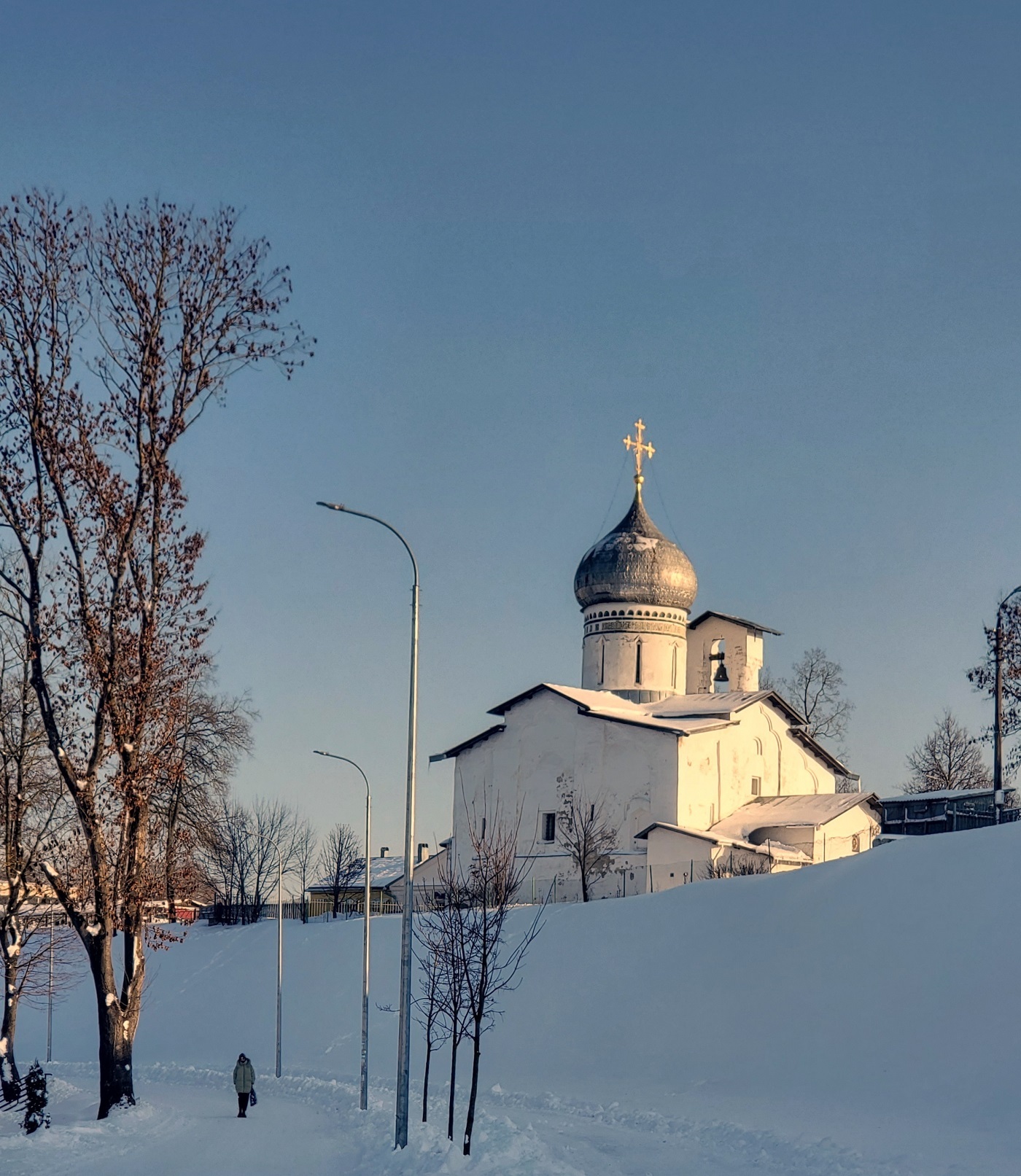 Это очень крутая псковская достопримечательность. Построена эта башня в 1525 году. Это было уникальное инженерное сооружение с подземным ходом, выходящим прямо к реке. Она не высокая, но большая в диаметре. Замечательное место для фотосессий. Рядом находится церковь Космы и Дамиана, старинная церковь 13 века. Но все это было на противоположном берегу, поэтому я любовался этой красотой издали. Все это я описываю по памяти, и возможно где-то допускаю неточности в описании. Поэтому кому интересно всю информацию может найти самостоятельно. Я только о своих эмоциях пишу. И тут плавала целая стая уток, который шумно взлетели, когда рядом съехал с горки маленький ребенок, катающийся тут на ватрушке. Далее пошел по Милицейской улице, оказывается, есть еще такие названия, по левому берегу Псковы. Там сплошной парк и летом все утопает в зелени. а сейчас все утопало в снегу. Дошел до пешеходного моста с видом на Богоявленскую церковь, на том берегу.