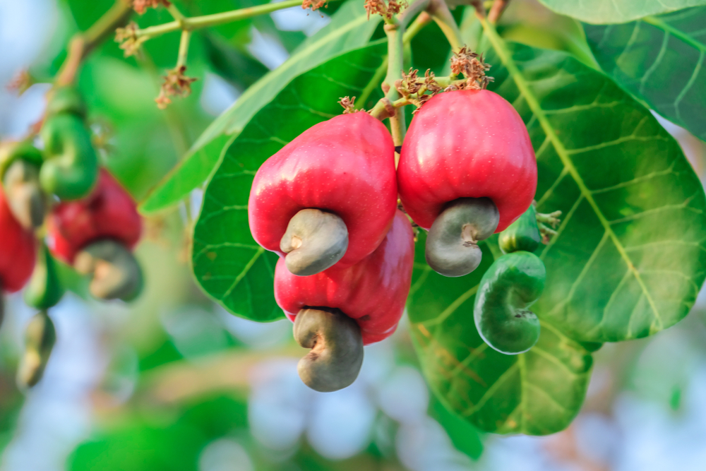 Кешью вырастают на конце так называемого псевдофрукта: яблока-кажу, которое на самом деле является разросшейся плодоножкой. Эти красные или желтые плоды, похожие на перец или грушу, тоже съедобны: они имеют сочную волокнистую мякоть и немного вяжущий, кисловатый вкус. Из яблок-кажу делают джемы, варенья, вина, соки.