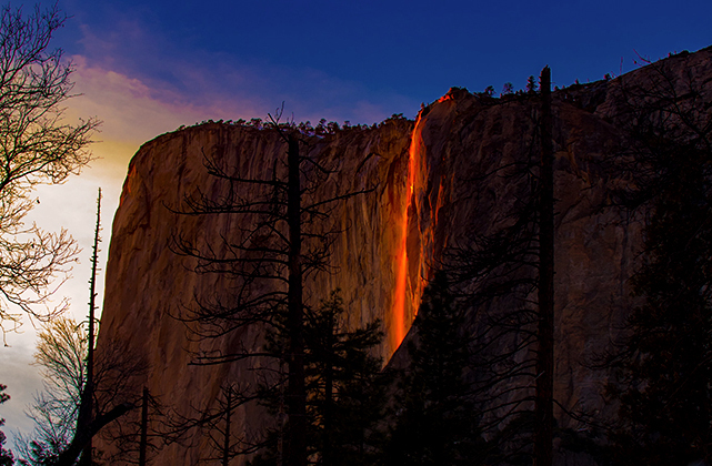 Еще одна удивительная природная иллюзия связана с водопадом Лошадиный Хвост, который находится в калифорнийском национальном парке Йосемити. В февральские дни потоки воды напоминают раскаленную лаву, стекающую из жерла вулкана. Именно поэтому водопад называется огненным и пользуется популярностью у фотографов. Причина явления проста: на закате лучи солнца окрашивают поток в ярко-оранжевые цвета.