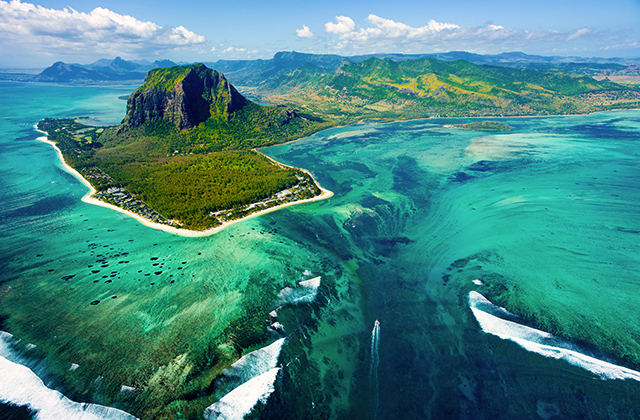 Пролетая над юго-западным побережьем острова Маврикий, можно увидеть крайне необычный водопад — подводный. Морской поток устремляется в океанскую бездну с коралловой отмели — это красивое зрелище просматривается даже со спутника (если набрать в поисковике Google Ле-Морн, Ривьер-Нуар, о. Маврикий). На самом деле это, конечно, не водопад, а оптическая иллюзия, созданная самой природой. Наслоения ила и песка и глубинные течения Индийского океана у берегов полуострова Ле-Морн-Брабан создают этот потрясающий обман, в который хочется верить, — видимость подводного водопада.