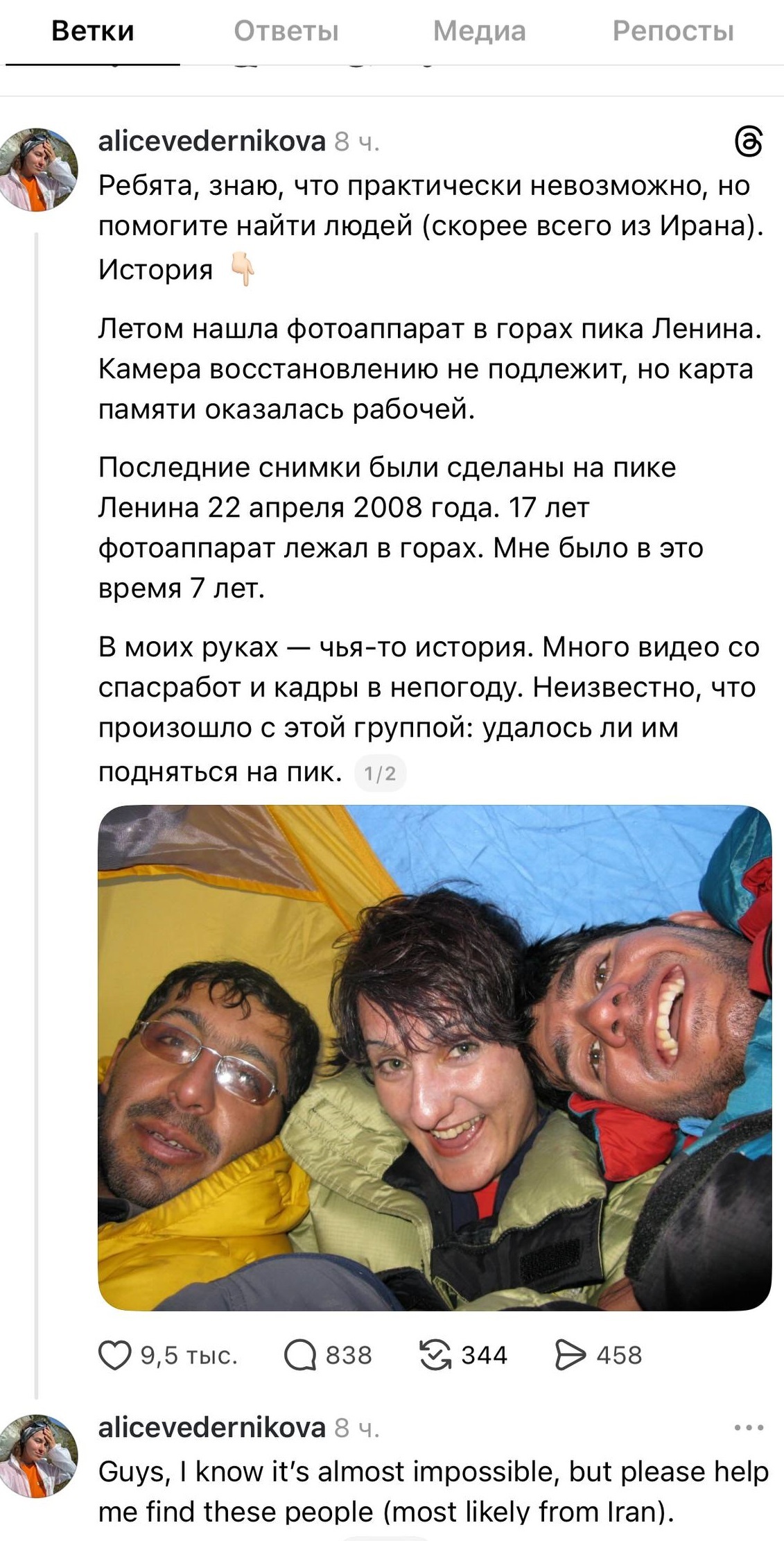 Первая попытка найти владельца камеры через социальные сети ни к чему не привела. Но в начале этого года Алиса попробовала снова — и на этот раз удача улыбнулась. Пост о находке завирусился в соцсетях, и вскоре откликнулась сама хозяйка камеры. Ей оказалась альпинистка и гид из Ирана, которая 18 лет назад поднималась на эту вершину. Ведерникова обещала рассказать ее историю, как только иранка ей поделится.