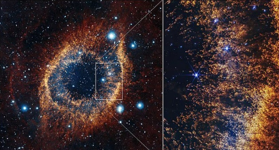 Расположенная в 650 световых годах от Земли туманность Спираль представляет собой оболочку из пыли и газа, оставленную солнцеподобной звездой, у которой тысячи лет назад закончилось топливо. Астрономы обнаружили невероятные структуры внутри газового кольца шириной в три световых года, образованного этой умирающей звездой. В НАСА отмечают, что эти снимки позволяют с близкого расстояния увидеть возможную судьбу нашего Солнца и планетной системы.