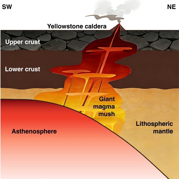 Традиционно Йеллоустон считался результатом работы мантийного плюма — узкой струи жара, поднимающейся от самого ядра Земли. Однако новая модель показала иную картину. Источником магмы является верхняя астеносфера (слой мантии сразу под жесткой литосферой).