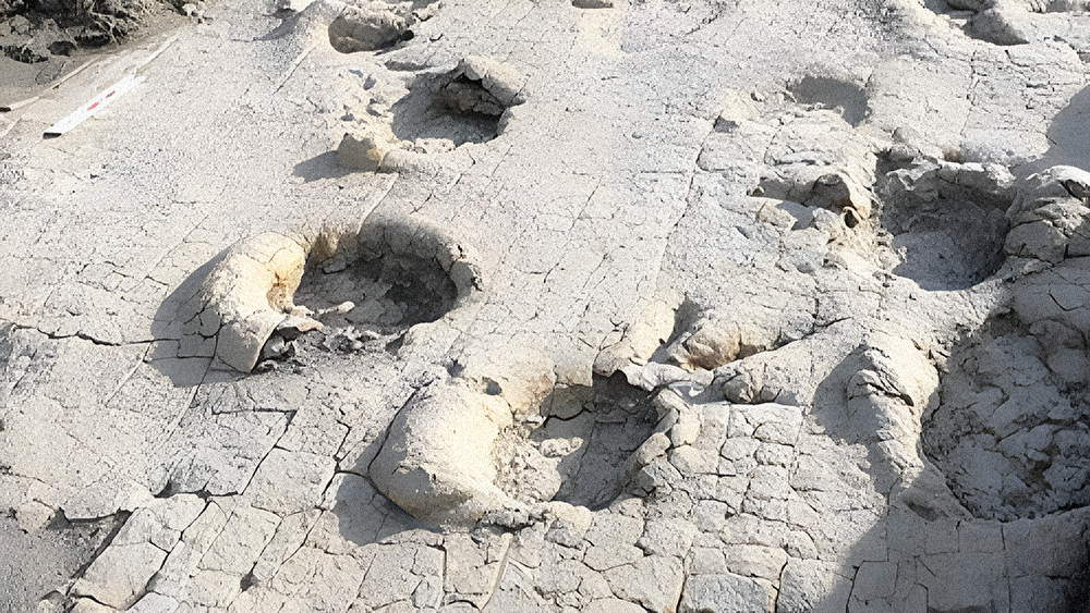 Следы сохранились в породах свиты Шинэхудаг — это осадки, которые накапливались в раннем мелу около 120 млн лет назад на дне большого озера. Среди тонких слоев черной глины встречаются прослойки тонкого песка. Эти песчаные «вставки» образовались, когда уровень воды понижался и участки дна временно высыхали. Именно по таким высохшим песчаным поверхностям, скорее всего, и прошли динозавры, оставив отпечатки.