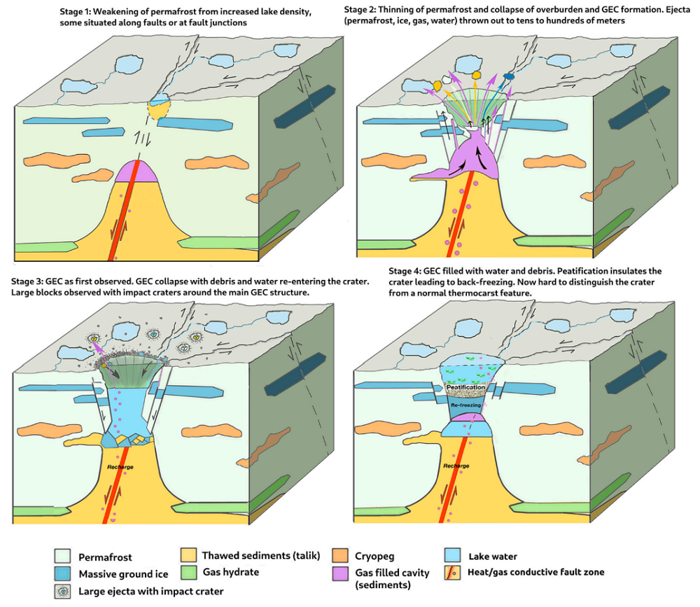 Группа геологов из Университета Осло (Норвегия) под руководством Хельге Хеллеванга предложила модель, которая объясняет, почему эти объекты появляются только на Ямальском и Гыданском полуостровах, а не в других арктических регионах с вечной мерзлотой. Исследователи согласны с тем, что главная причина взрывов — скопление метана под большим давлением. Однако если раньше считалось, что виной всему — лишь процессы в самой мерзлоте, то новое исследование это опровергает.