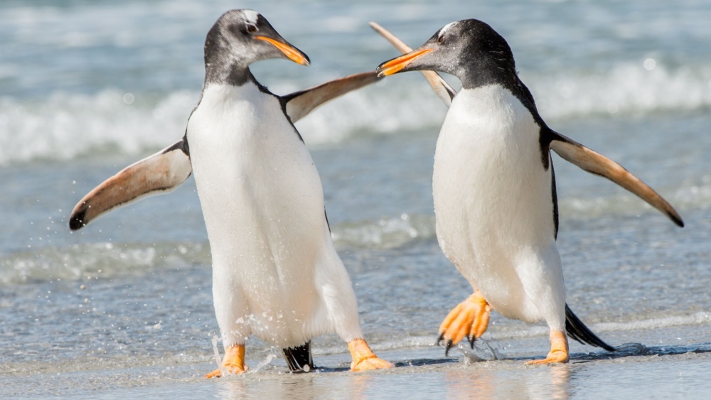 Из набегающих волн на берег вышла пара пингвинов. Не спеша, они направились по мокрому песку к сухой отмели, время от времени обмениваясь взглядами. Их синхронная походка и то, как они были сосредоточены друг на друге, создавали ощущение настоящего свидания.
