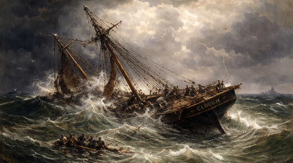 «Клаф» построили в 1867 году в Лорейне как рабочее судно для перевозки камня. Это был не пассажирский корабль, а «трудяга» коммерческих линий Великих озер. Моряки называли его барком — трехмачтовым судном со смешанным парусным вооружением (квадратные и косые паруса), рассчитанным на тяжелые регулярные рейсы.