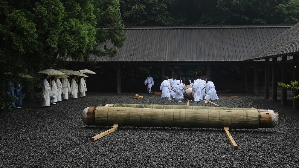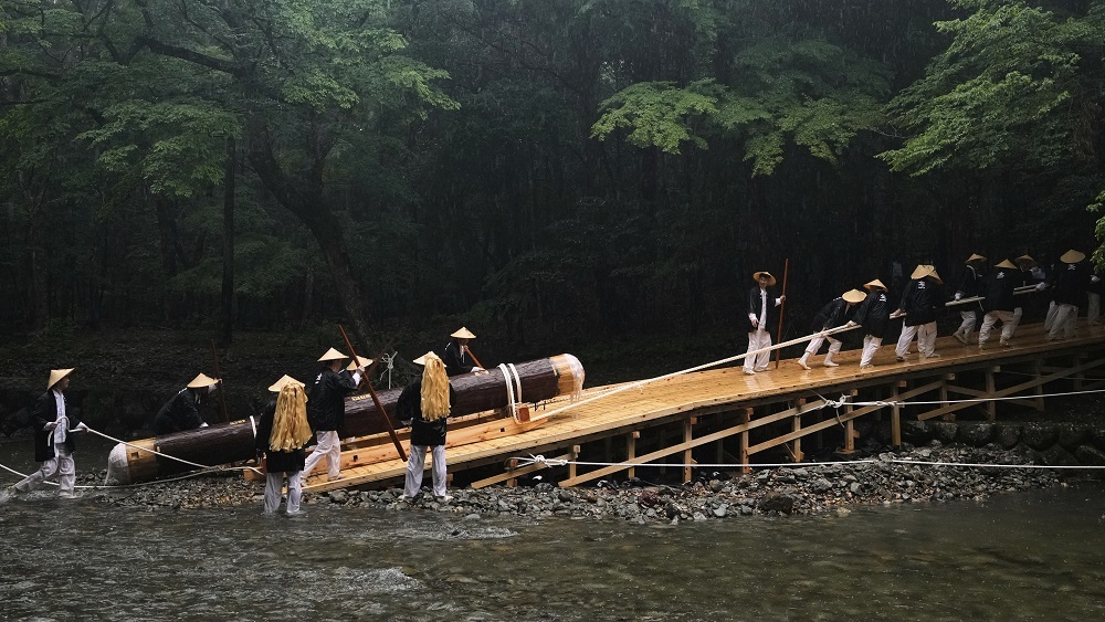 Каждый этап строительства — это сложный ритуал. Ночью, при свете фонарей, жрецы проводят тайный обряд очищения священного столба, который будет установлен под полом главного храма. А утром десятки мужчин, ритмично напевая, заходят по колено в воду реки Исудзу, чтобы перетащить двухтонные бревна к месту строительства.