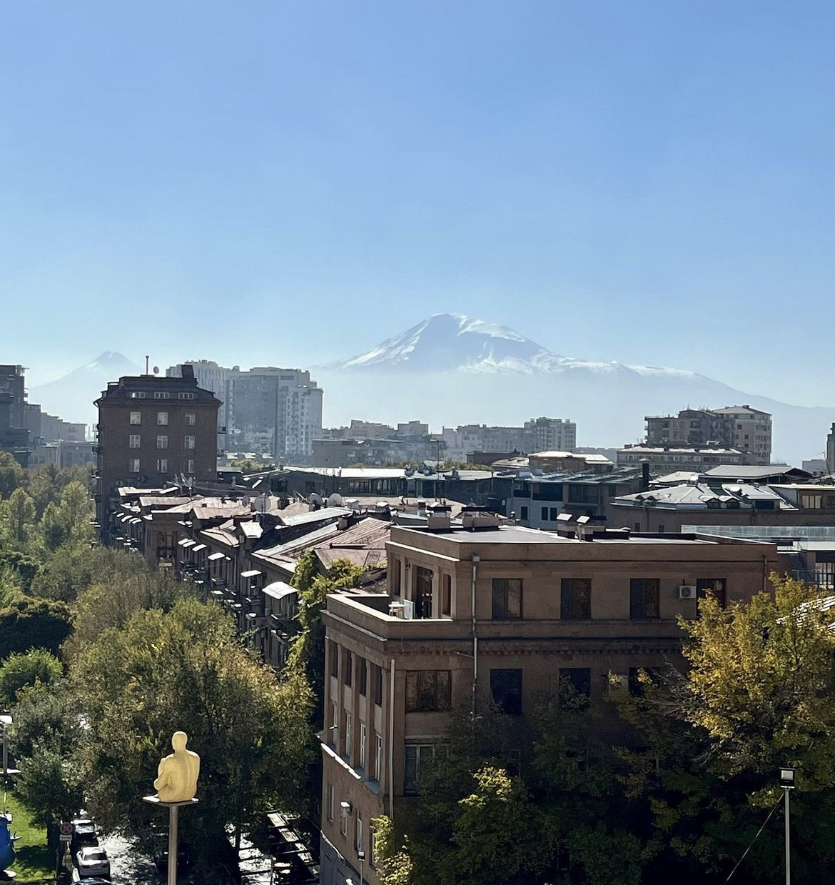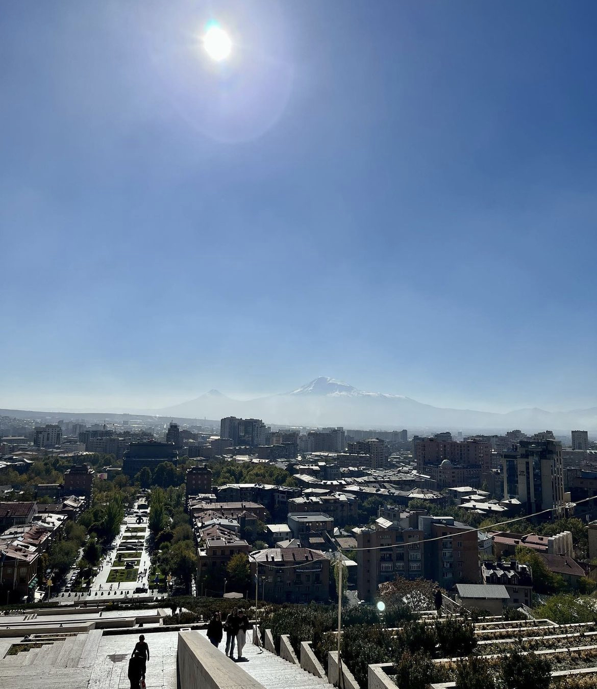 Парадная лестница, соединяющая пять открытых террас с фонтанами, — место тусовки местной молодёжи, скопления туристов, фотографов и молодожёнов. С самой высокой террасы открывается изумительный вид на город и священную гору Арарат (в безоблачную погоду, разумеется). Нам повезло — Арарат прямо за моей спиной!