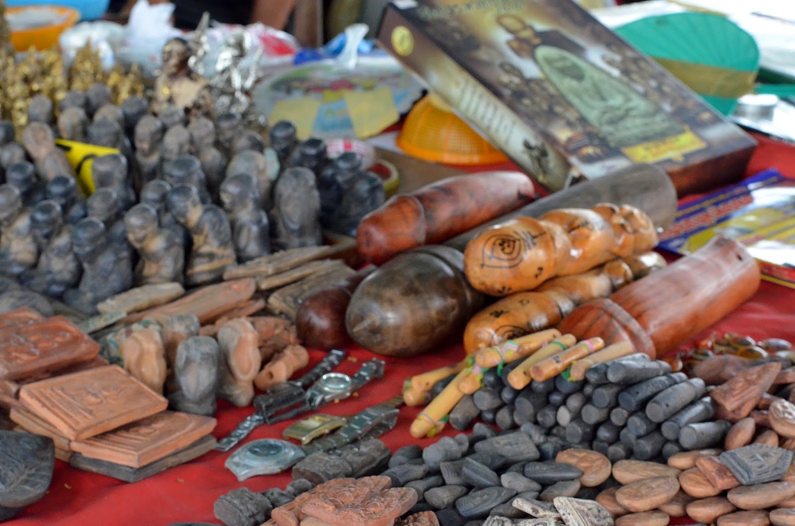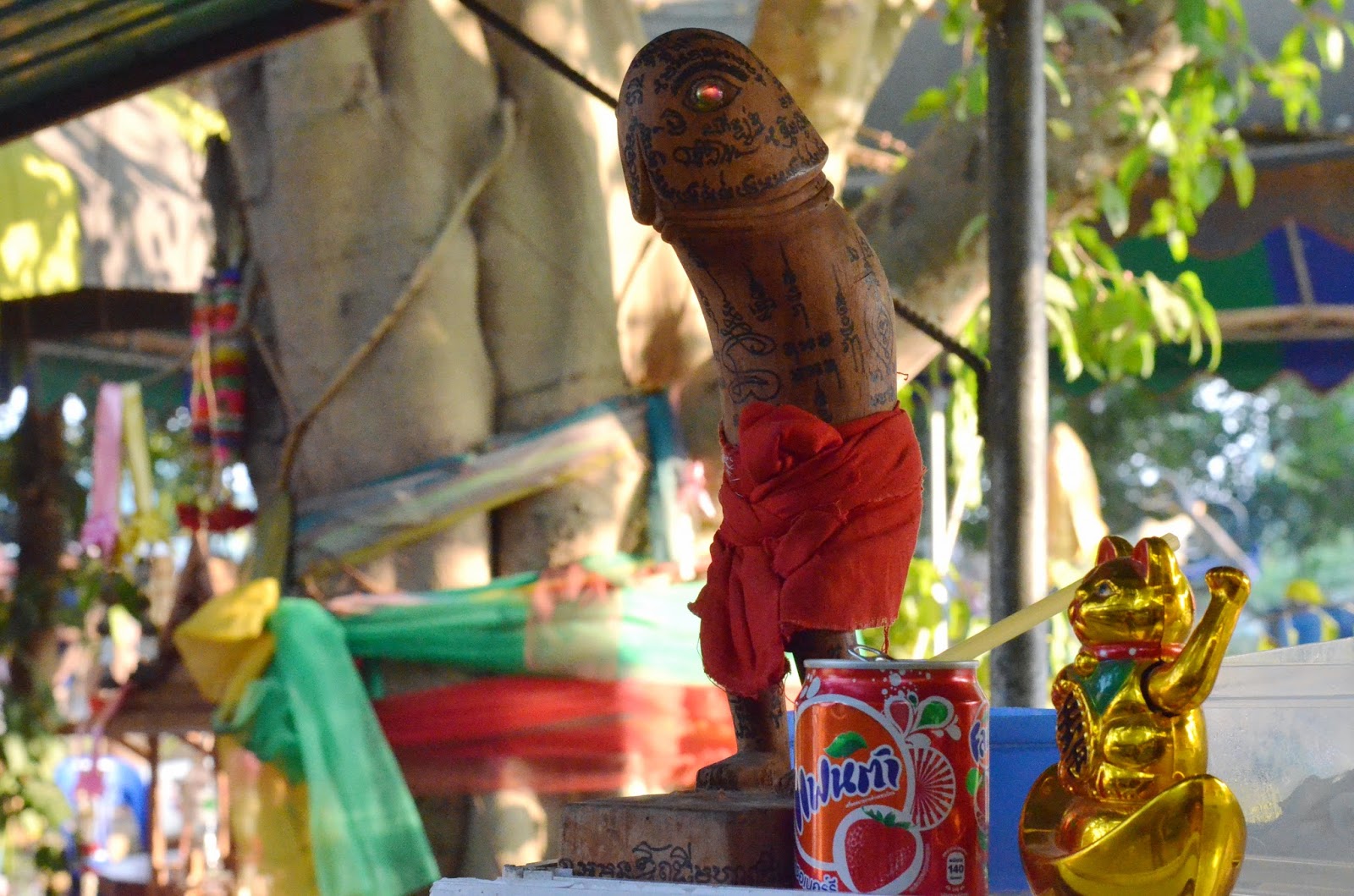 Обратимся к практике использования фаллической символики в Таиланде, где по большей части были собраны фотографии для этой статьи. Как известно, в основной массе тайцы очень суеверны и часто прибегают к помощи амулетов и всевозможных магических средств. Они требуются, в первую очередь, для защиты от духов и улучшения здоровья и благосостояния. Существует обычай вешать на шею детям, в особенности мальчикам, маленькое изображение фаллоса из слоновой кости. Оно выступает в качестве оберега, охраняющего ребенка от дурных влияний. Взрослые носят изображение совокупляющейся пары – «пан мек», которое, как принято считать, поднимает настроение и укрепляет потенцию. На рынке амулетов в Бангкоке удалось обнаружить деревянные фаллосы разных размеров и форм. Некоторые из них имеют глаза и своеобразные лица, иные покрыты рисунками и загадочными письменами.