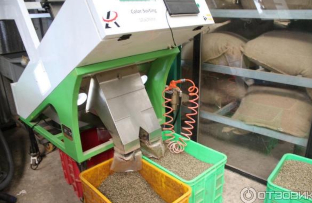 Высушенные зерна сначала проходят сортировку по размерам через разные сита. Стоят в цехе машины по сортировке зерна - по размеру и по плотности.