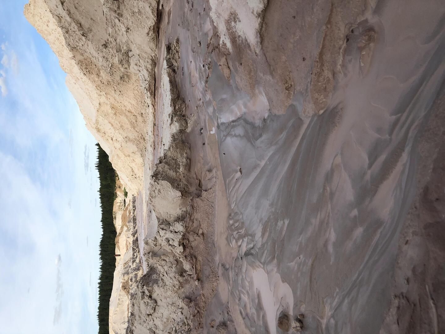 Одна из чаш карьера на которой не ведутся работы начала подтопляться и превратилась в озеро, с водой невероятно красиво цвета, берега которого покрыты мягким белым песком.