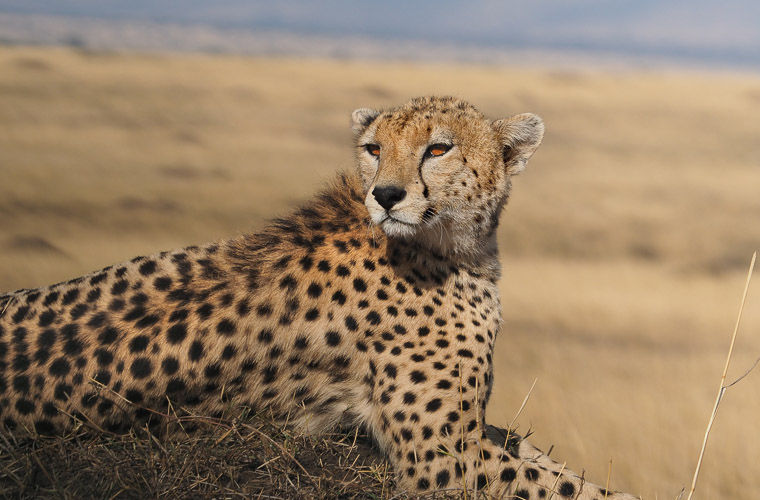 Еще в Масаи-Мара живут гепарды. Эти животные тоже довольно редки, и мы боялись, что не сможем их найти, но нам повезло! Однажды в поисках слонов мы случайно наткнулись на одного гепарда. Моузес завидел его за 300 метров и развернул машину. Грациозно и красиво гепард возлежал на старом термитнике, прячась от солнца в тени дерева. Он даже не шевельнулся, когда наша машина подъехала к нему. Ему было все равно, что мы рядом. Истинный хозяин положения. У гепарда есть рудиментарный коготь. Именно им он ловит добычу, когда настигает ее. Сначала он подкрадывается к своей жертве на 20-25 метров, потом начинает бежать, быстро разгоняясь до скорости почти 70 км/ч, потом делает рывок-ускорение, достигает своей фантастической скорости (иногда до 120 км/ч) и, наконец, прыгает. Тут-то ему и помогает рудиментарный коготь, которым гепард зацепляется за жертву и наносит ей рану, сваливающую ее с ног. У гепардов очень слабые челюсти, которые не могут прокусить шкуру животного, и поэтому они душат, а не кусают ее. Гепарды могут бежать очень быстро, но не долго. Он бежит рывками и если ему не хватит рывков, то он проиграет битву за еду. У гепардов есть черные линии от глаз до подбородка, их еще называют "линии слез". Эти линии помогают ему охотится при ярком солнечном свете. А когда гепард открывает рот, то эти линии делают его морду страшнее, и отпугивают других зверей. Еще гепарды издают такие звуки, как птички - чирикают, чтоб львы не заметили, как мама завет своих малышей.
