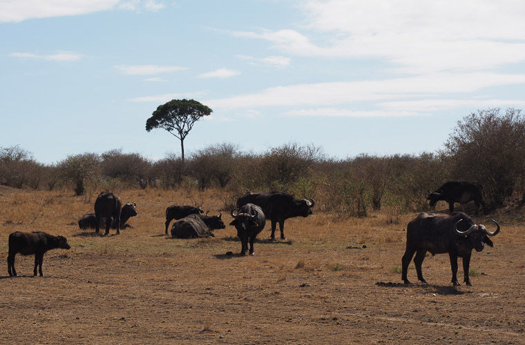 Чтобы закрыть рассказ о животных из Большой африканской пятерки, я расскажу о буйволах. Их мы, конечно, тоже встретили. И не раз. Эти животные считаются самыми опасными в Африке, потому что они очень истеричные и злые. Никогда нельзя сказать наперед, что этим огромным черным тушам придет в голову. От этих зверей гибнет больше людей, чем от всех больших кошек вместе взятых. У кенийцев есть легенды, связанные с этими животными. Одна рассказывает о том, что когда-то давно боги подарили масаям коров. Но за то, что те убивали их и ели, боги создали корову с рогами, которая может постоять за себя. Это и есть буйвол. Вторая же легенда рассказывает о том, что буйволы в прошлой жизни были комарами. Они возвращаются на землю, чтобы отомстить людям за свою смерть.