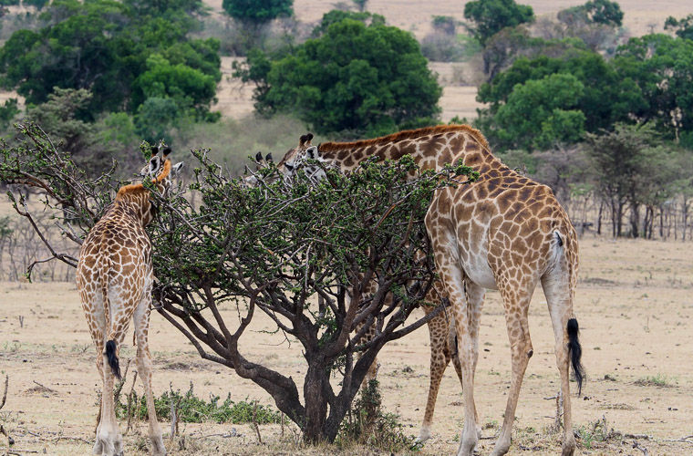 В Масаи-Маре живут жирафы. Нам несколько раз посчастливилось видеть их в разных концах заповедника. Жирафы очень пугливы, к ним трудно приблизиться. Но однажды нам удалось подобраться к ним очень близко. Мы наблюдали за дракой между двумя молодыми жирафами. Это одновременно и грустное, и забавное зрелище. Один жираф наносит удар по другому своей головой. Звук при этом глухой и очень неприятный. А потом этой же головой подныривает под ногу противника и задирает ее наверх, пытаясь повалить его таким образом на землю. Нам показалось, что больше от схватки страдал не тот, кому доставались удары, а тот, кто их наносил - все-таки голова - не самое удачное оружие. Мы постоянно думали о том, какие эти животные странные, медлительные и незащищенные, но мы ошибались. Поработав потом с книжками и статьями, мы выяснили много интересного о жирафах. Например, они - самые высокие млекопитающие. Длинная шея жирафа дает ему возможность издалека видеть опасность, глаза посажены так, что он может видеть в разные стороны, не поворачивая головы, а длинные ноги помогают без особых затрат преодолевать большие расстояния довольно быстро. Их кожа очень прочная. Масаи даже делают из нее щиты. А для того, чтобы сделать жирафам укол, люди стреляют в них специальными шприцами - иначе кожу не пробить. Некоторые леопарды отваживаются охотиться на жирафов, но они прибегают к хитрости - они загоняют жирафов в скопление деревьев, а те запутываются своими длинными шеями в ветках. Спят жирафы очень мало, им хватает пары часов в день. Рисунок на их теле - всегда уникальный, и чем он темнее, тем старше жираф.
