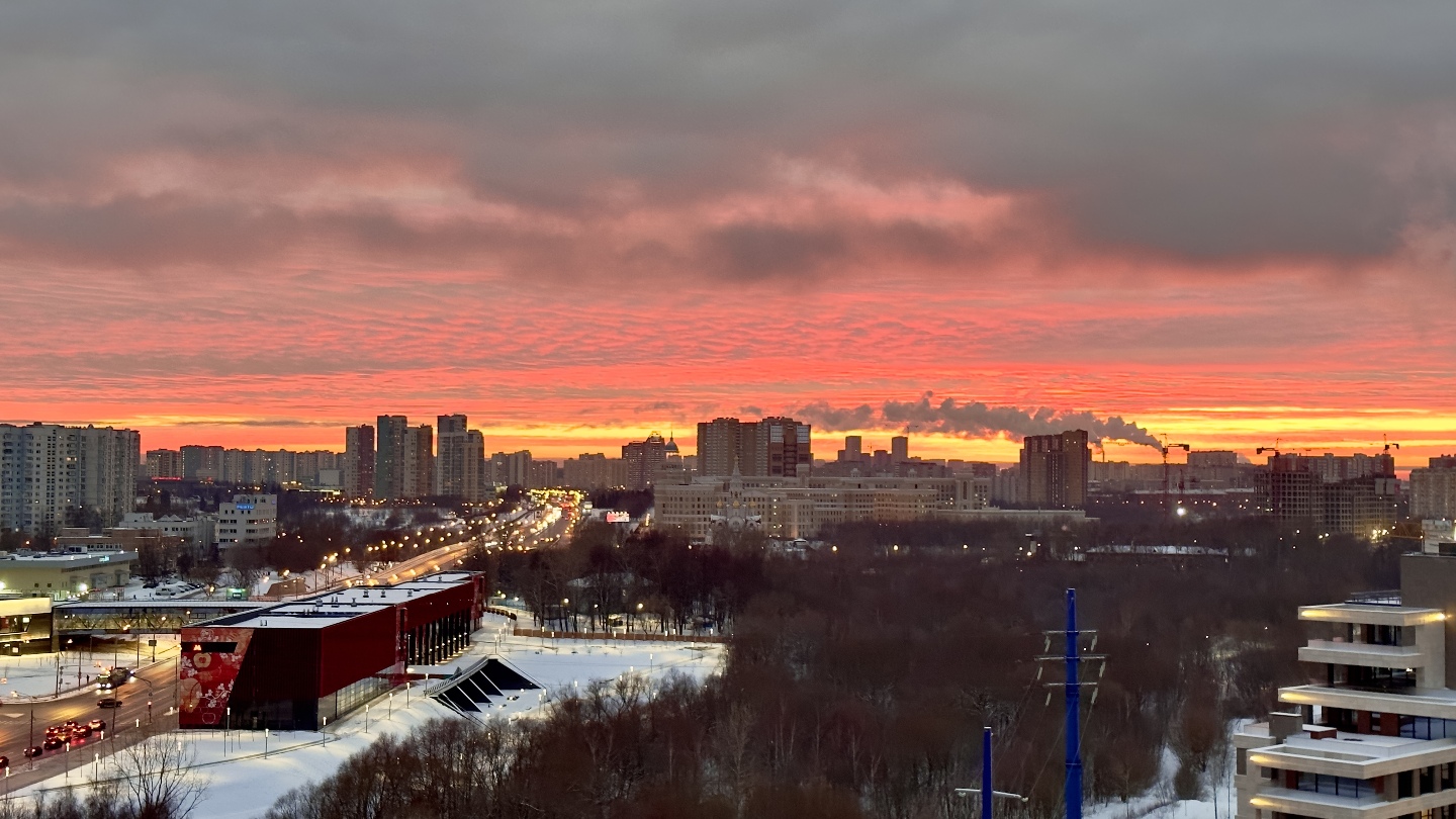и панорама одного из спальных районов на западе Москвы на закате...