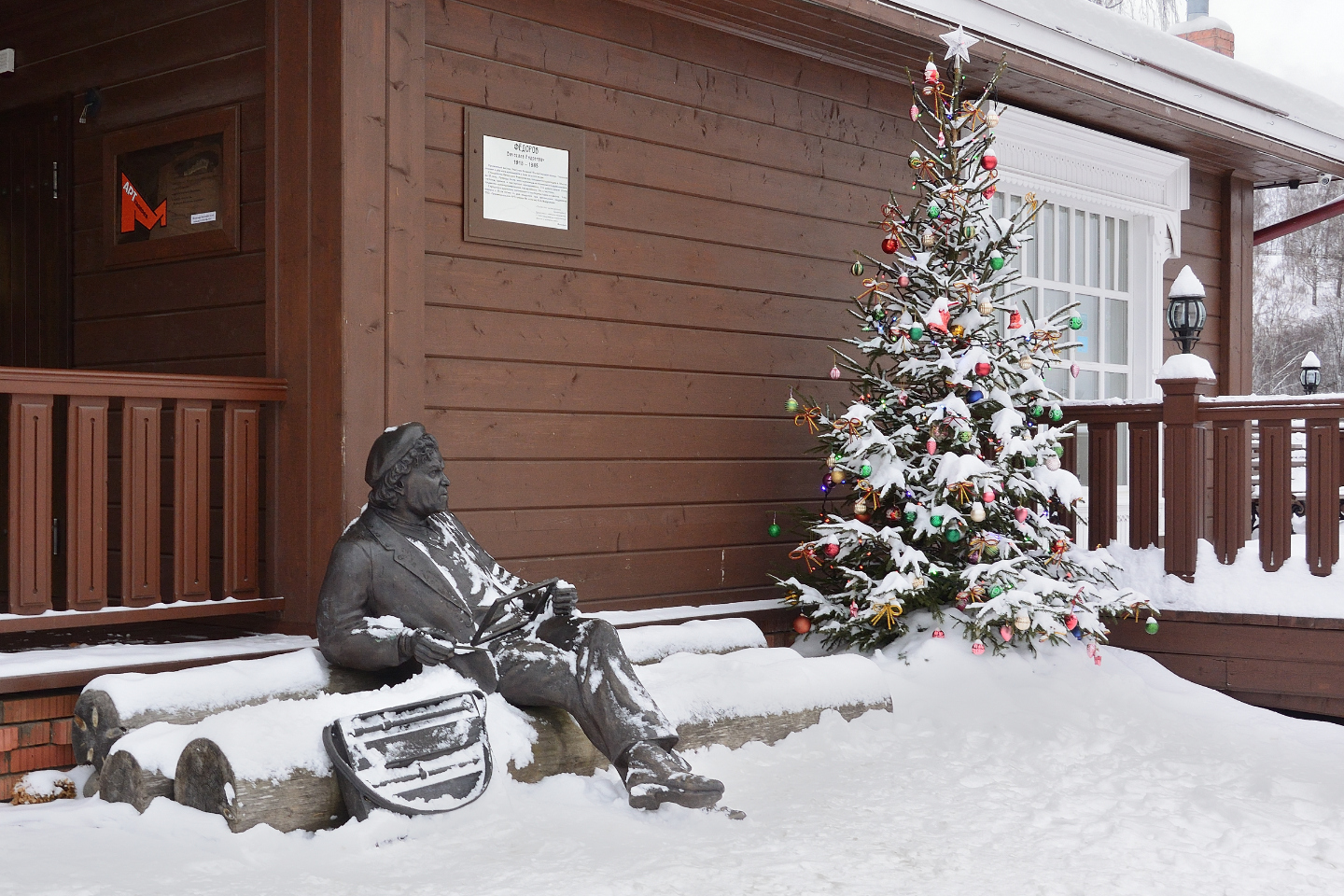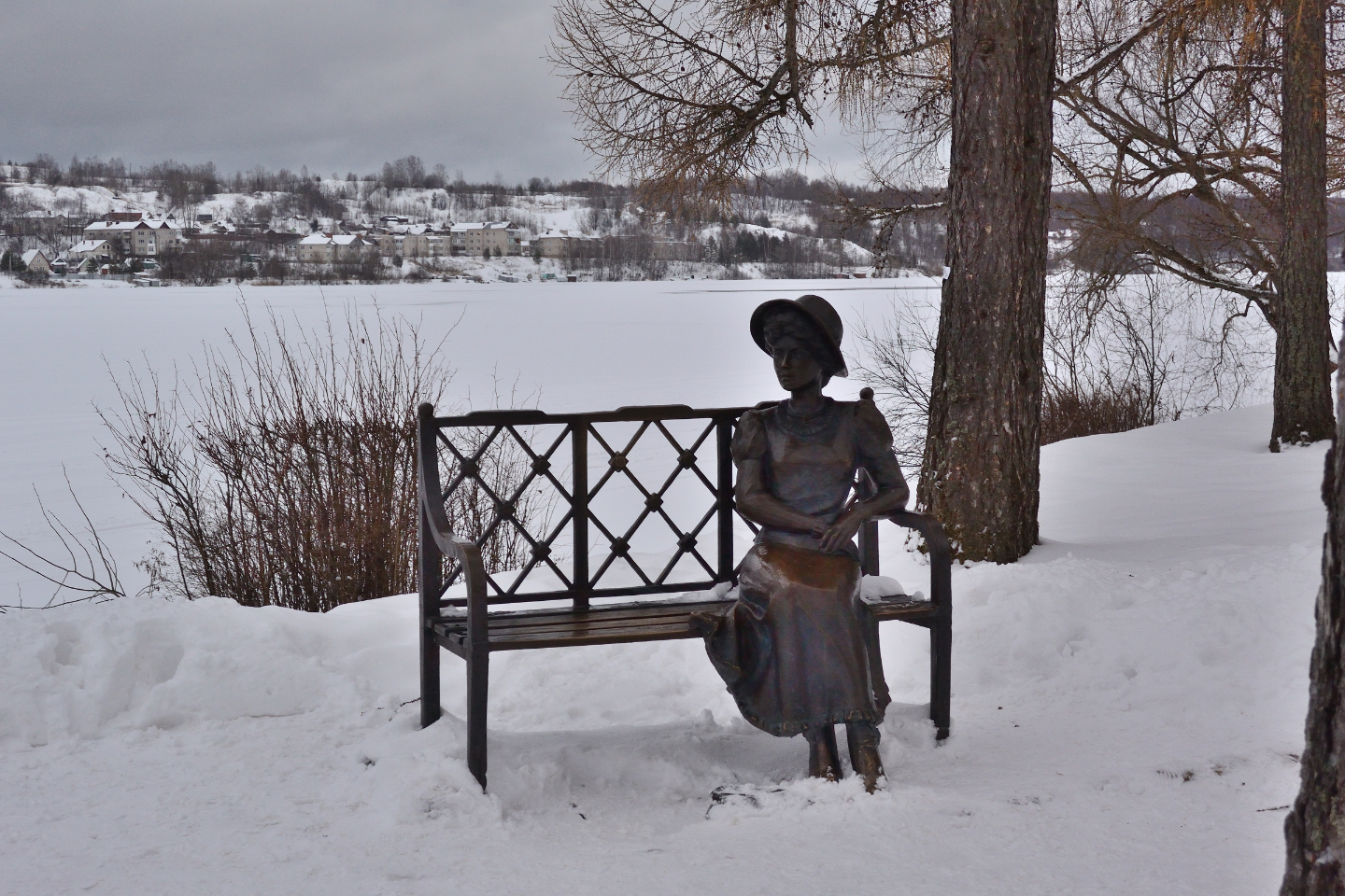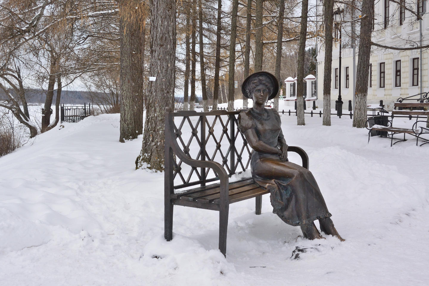 В конце набережной, у Музея пейзажа на скамейке под лиственницами сидит «Дачница». Это памятник художнице Софье Кувшинниковой, спутнице Левитана. Отличная работа!