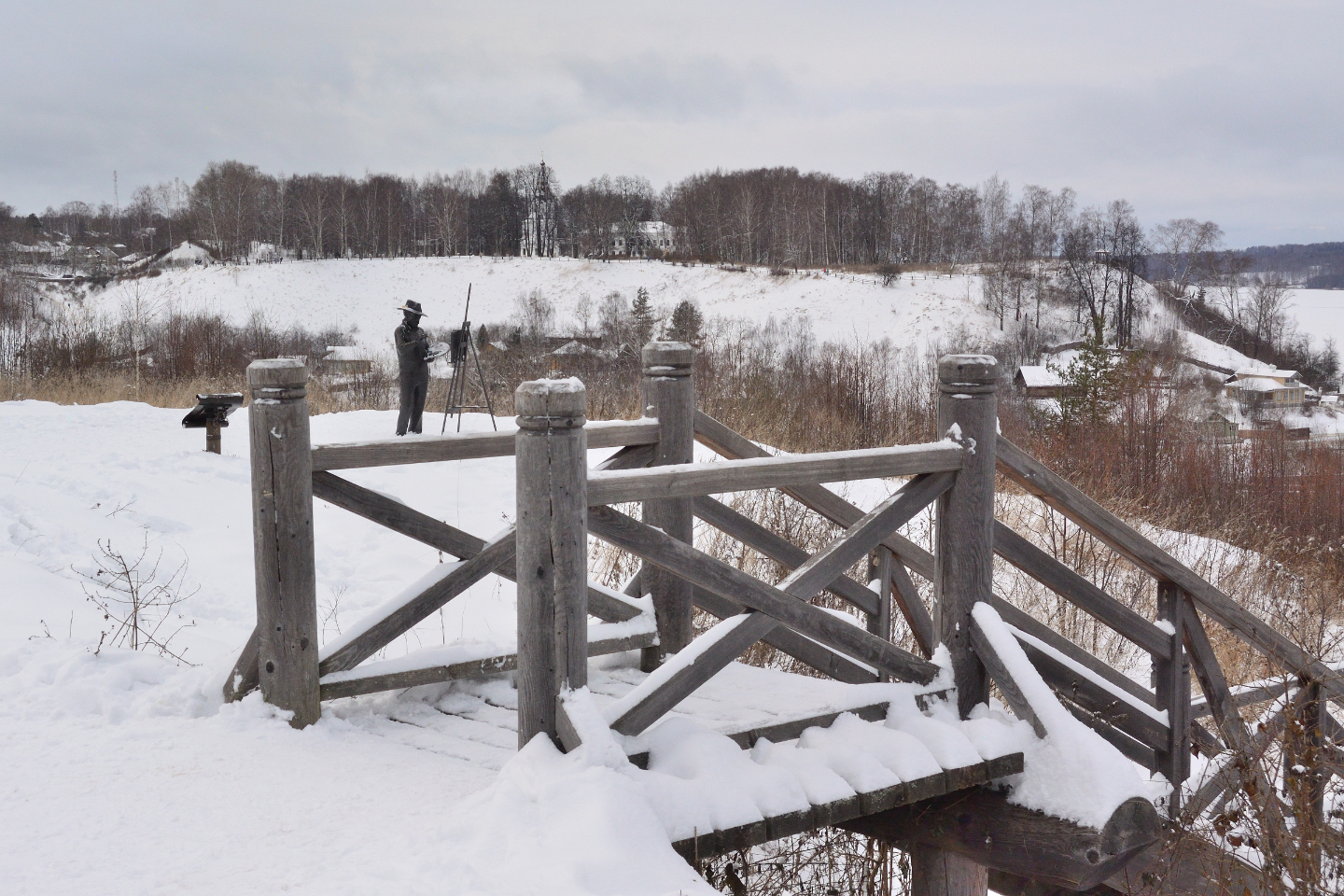 Весь исторический Плес уютно расположился на склонах двух холмов: это Соборная гора и гора Левитана. Меж ними течет речушка – Шо́хонка. На гору Левитана ведет крутая деревянная лестница – запыхаешься, пока взойдешь. Здесь еще одна видовая точка. И еще одна замечательная скульптура: художник за работой. Сам Левитан, а кто же ещё!