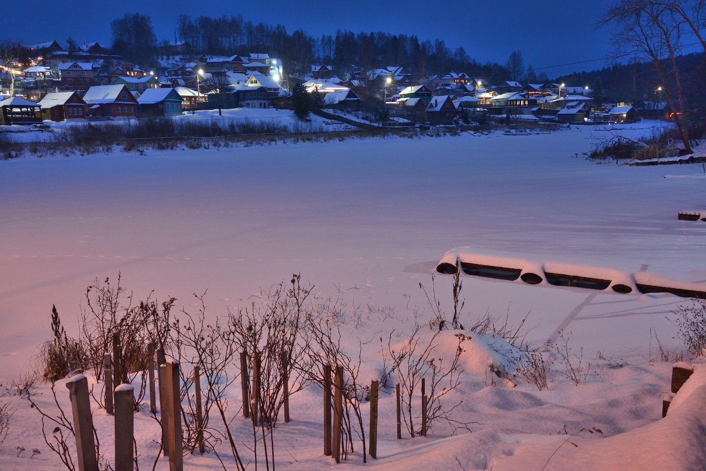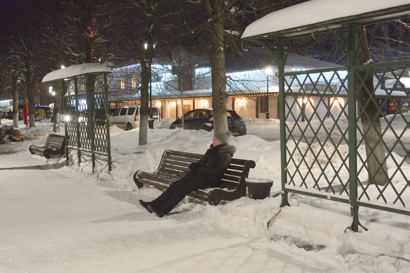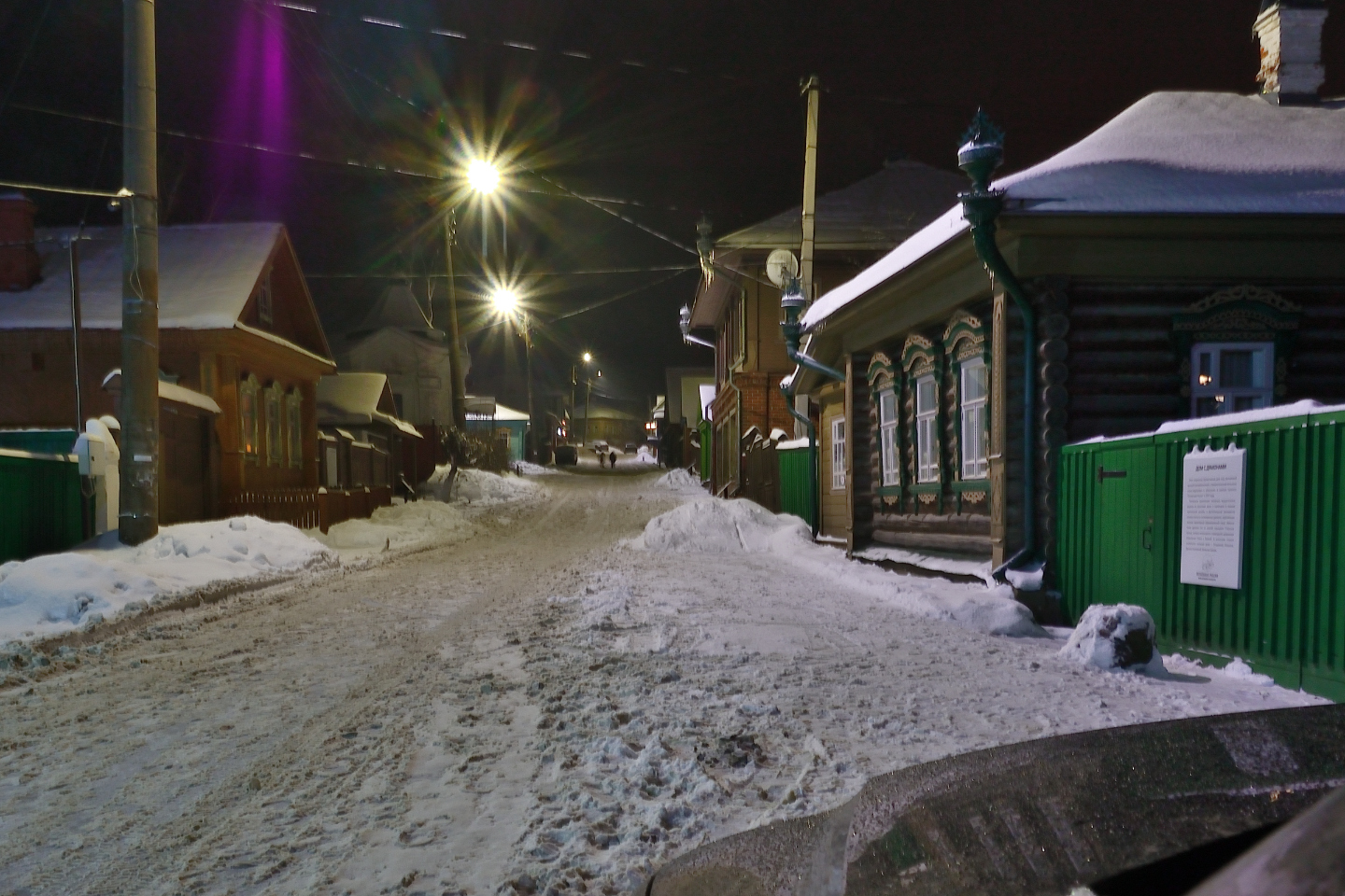 Вечером этого дня, остыв после лыжной разминки, мы снова гуляли по вечернему Плесу. После лыж ноги слегка гудели, поэтому решено было ехать в центр на машине. Проблем не возникло – подъехали к блокпосту, остановились, шлагбаум открылся, продолжили движение.