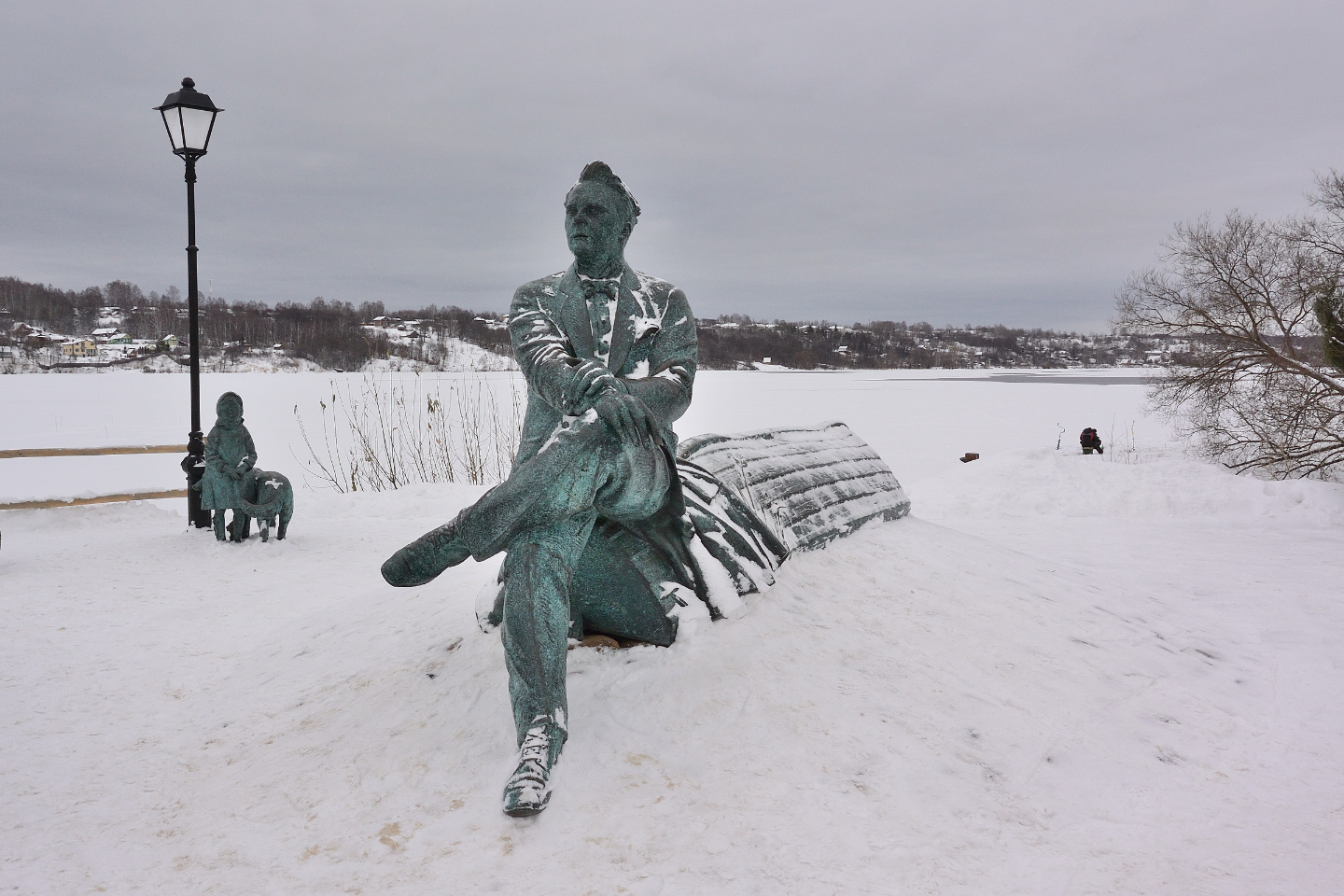 Мы не увидели в Плёсе формальных монументов типа «Я♥Плес». Но скульптуры в городе замечательные, очень уместные и вызывающие эмоции, что самое главное в искусстве. Недавно, в сентябре 20-го года в Плесе был установлен памятник Шаляпину. Точнее, не памятник, а целая композиция. Рядом с Шаляпиным, присевшим на перевернутую рыбацкую лодку, стоит крестьянская девочка с собакой. Очень душевно!
