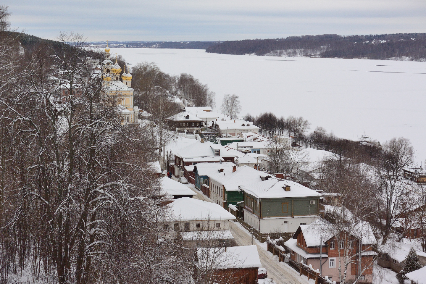 После обеда идем на прогулку. Зимой световой день короткий. Но пройтись по центру и сориентироваться времени нам сегодня хватит. Первая точка, где мы оказались это Соборная гора. Отсюда видно и Волгу и весь город. На горе сразу понятно, в чем изюминка Плёса. Конечно, в его особой локации. Холмистый рельеф, река, малоэтажная застройка – все это создает именно ту привлекательность, из-за которой жители больших городов стремятся путешествовать по провинции. Не зря окрестные красоты так поразили великого пейзажиста Левитана, что он несколько лет провел в этих местах за работой, создав выдающиеся творения.