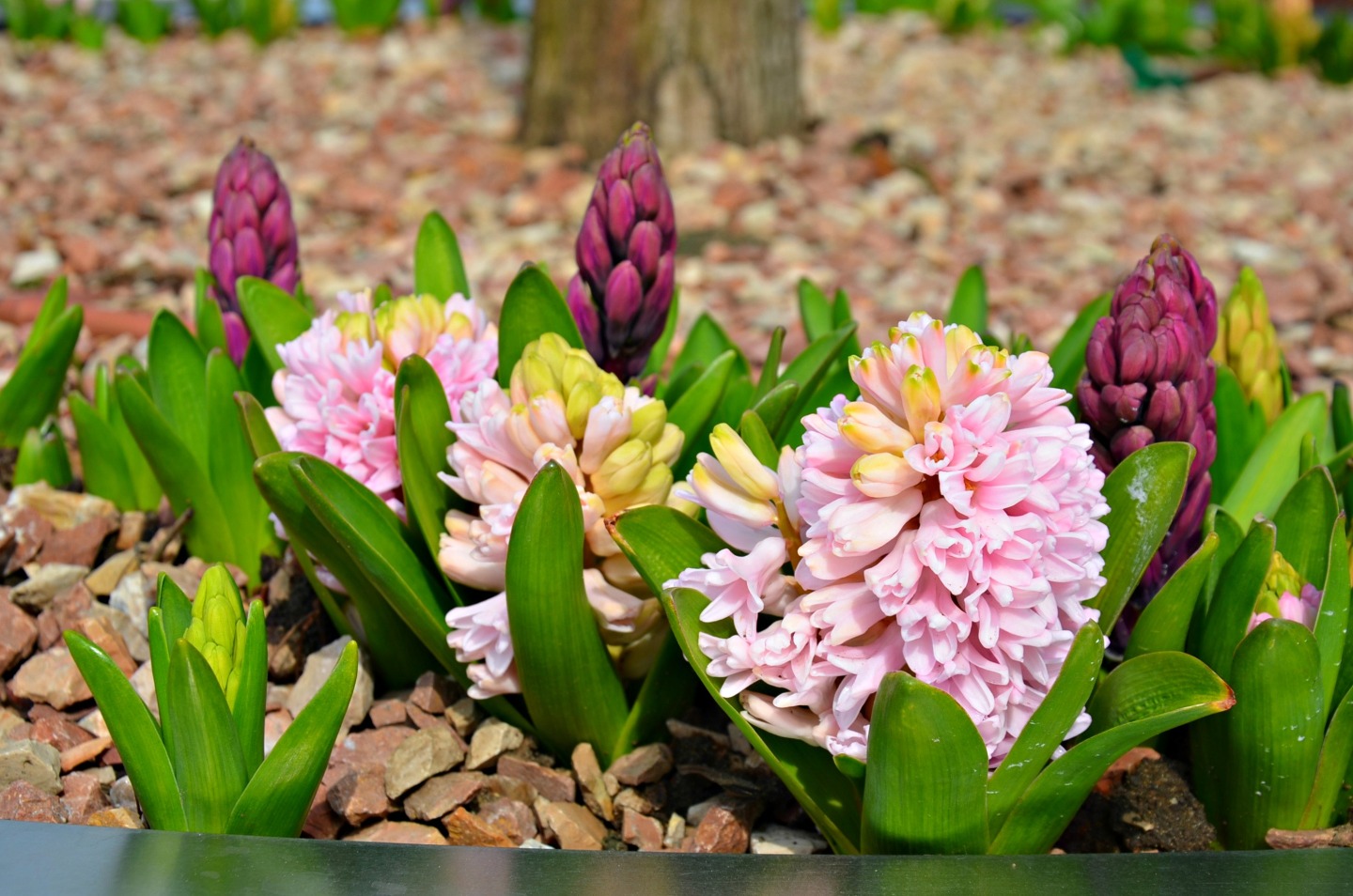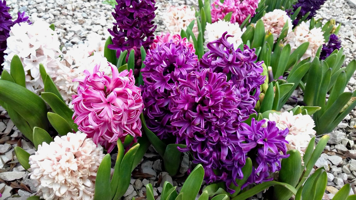 В кадках цветут гиацинты, весенние цветы.
