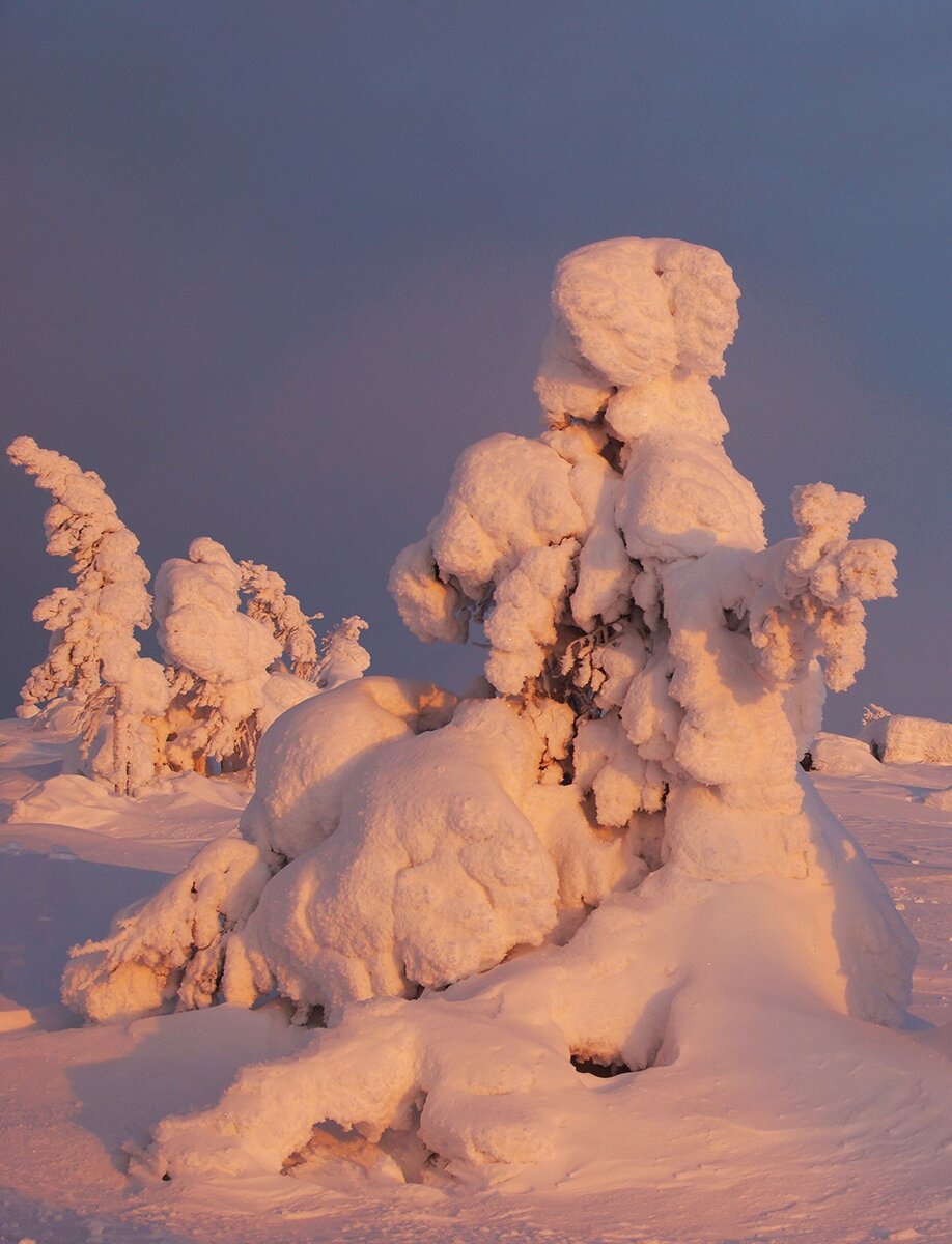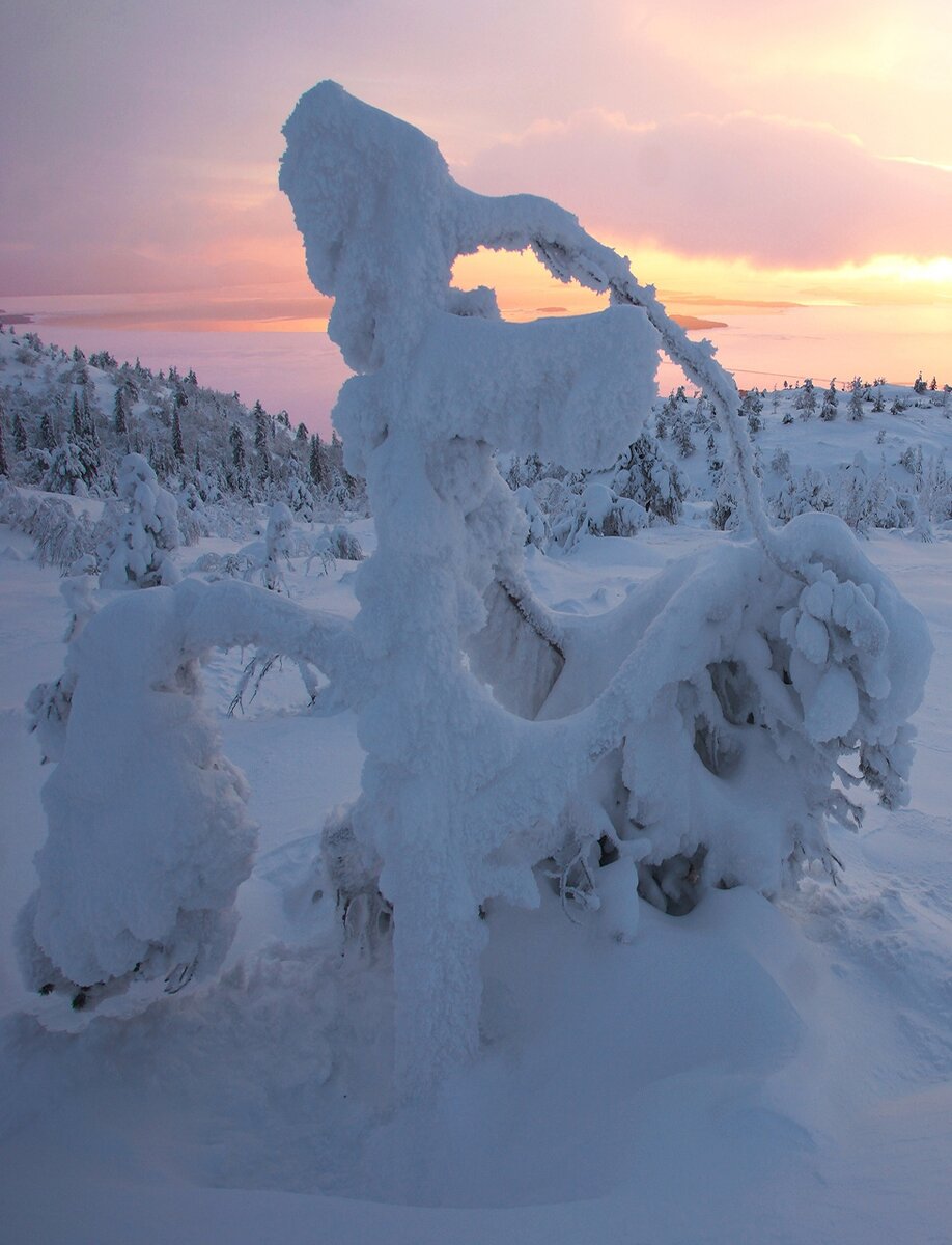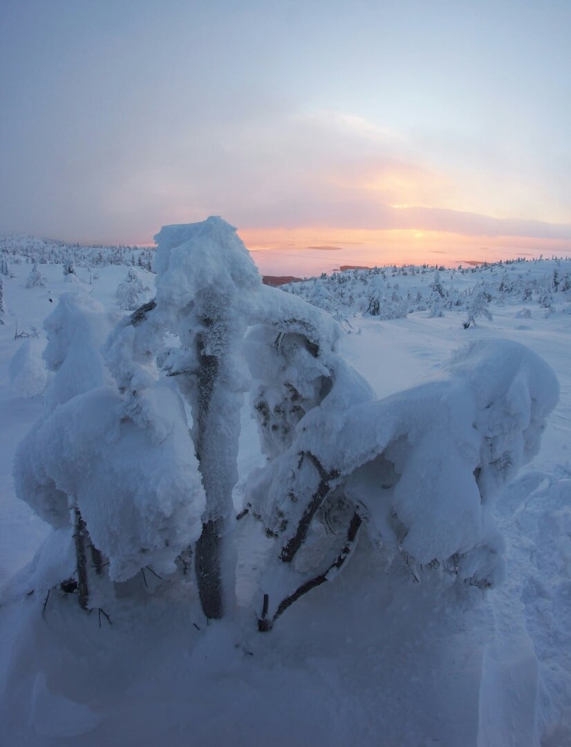 Где-то далеко за Северным полярным кругом, на склонах Волосяной горы, каждую зиму снег и иней создают из деревьев неповторимые скульптуры. Некоторые из них похожи на животных, другие на сказочных персонажей - смотря под каким углом посмотреть. Несколько лет назад мне удалось их поснимать. Всего-то два часа съёмки на морозе, в динамически меняющемся освещении, - и получились такие оригинальные картины. Чем дольше на них смотришь, тем больше разных силуэтов удается рассмотреть.