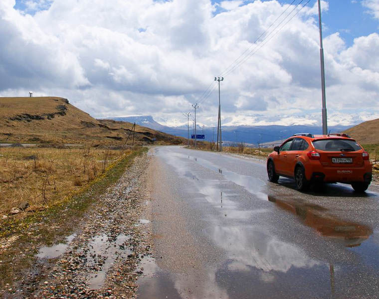 Дорога петляет все выше и выше, нас встречает поземка и снег, это в середине мая! Но неудивительно, навигатор показал высоту над уровнем моря 2523 м.