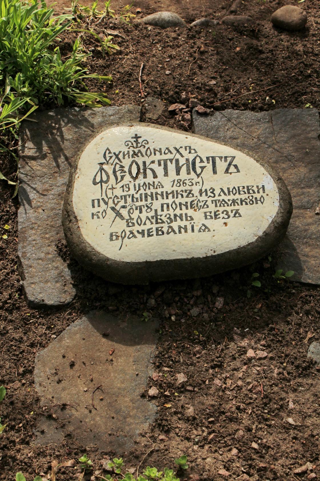 А вот эти надгробья монахов — простые беленые булыжные камни среди густой травы.