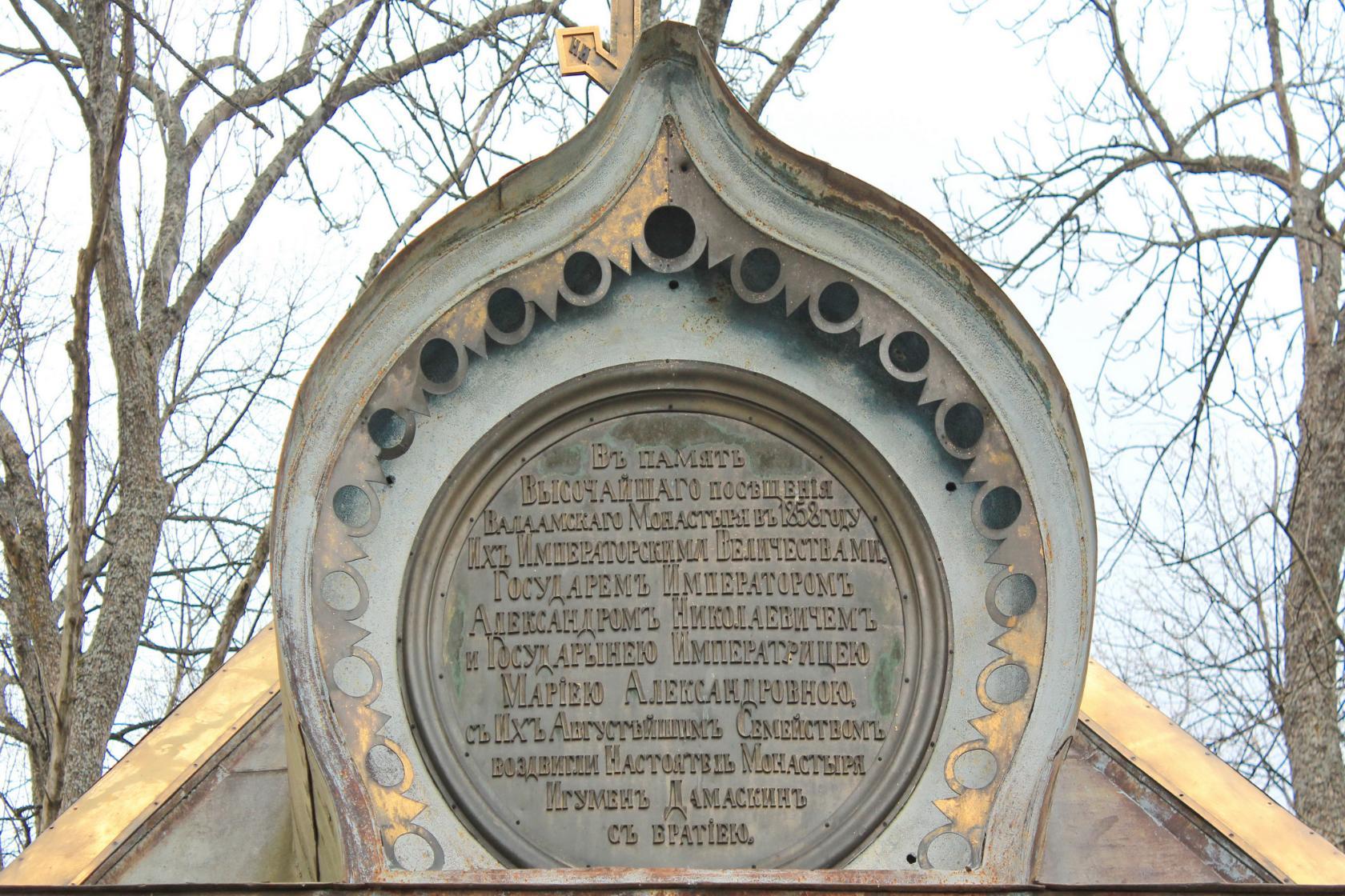 Знаменская часовня перед монастырем Валаама находится напротив Обелиска. Еще ее называют Царская часовня, построена в 1862 году в честь посещения острова Валаам Императором Александром Вторым. Часовня из серого гранита и полосатого мрамора, мозаичная икона современной работы.