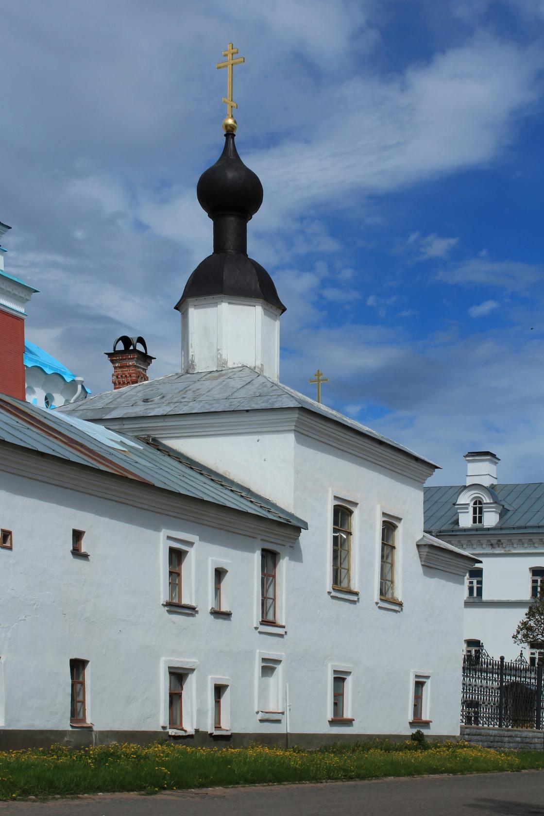 Бывшая Никольская церковь, 1792 постройки, которая была упразднена в связи с постройкой одноименного скита. В 1897 году здесь была обретена чудотворная икона Божьей Матери. Теперь это первая в России церковь Валаамской иконе Божьей Матери, храм освящен в 2005 году. Сфотографировать с другой стороны мешало солнце даже сквозь тучи. Зато хорошо видны окна келий разного размера, кельи с большим окном предназначены для сна и т.п., с маленьким, не отапливаемые – для молитвы.