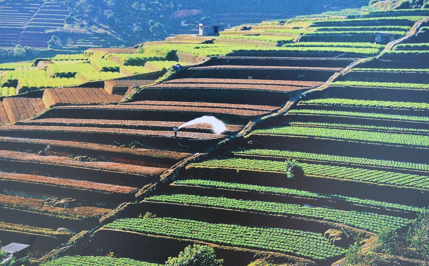 Цветочная рассада ступенчатыми террасами занимала холмы, ведь привычных нам полей тут нет, а потому только террасные поля.