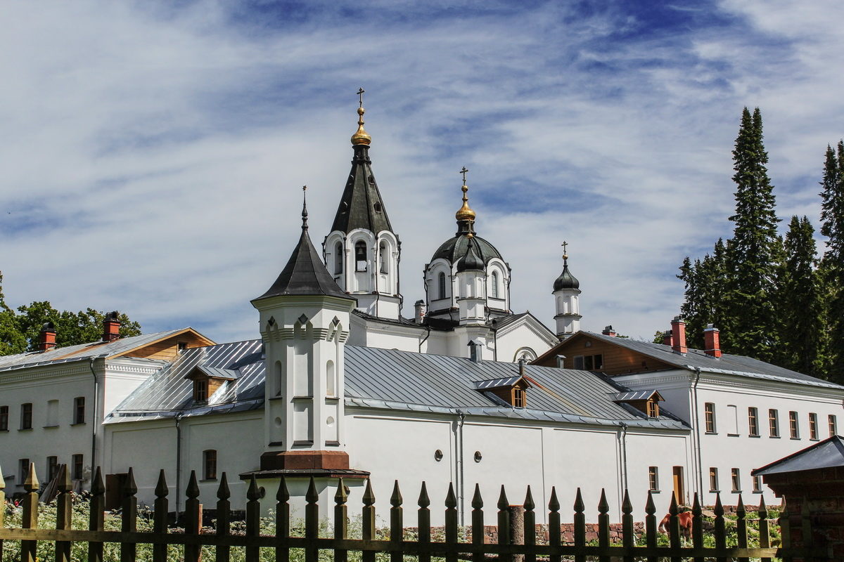 Наконец то дорога выводит в Смоленскому скиту. Доминанта скита это храм во имя Смоленской иконы Божией Матери.