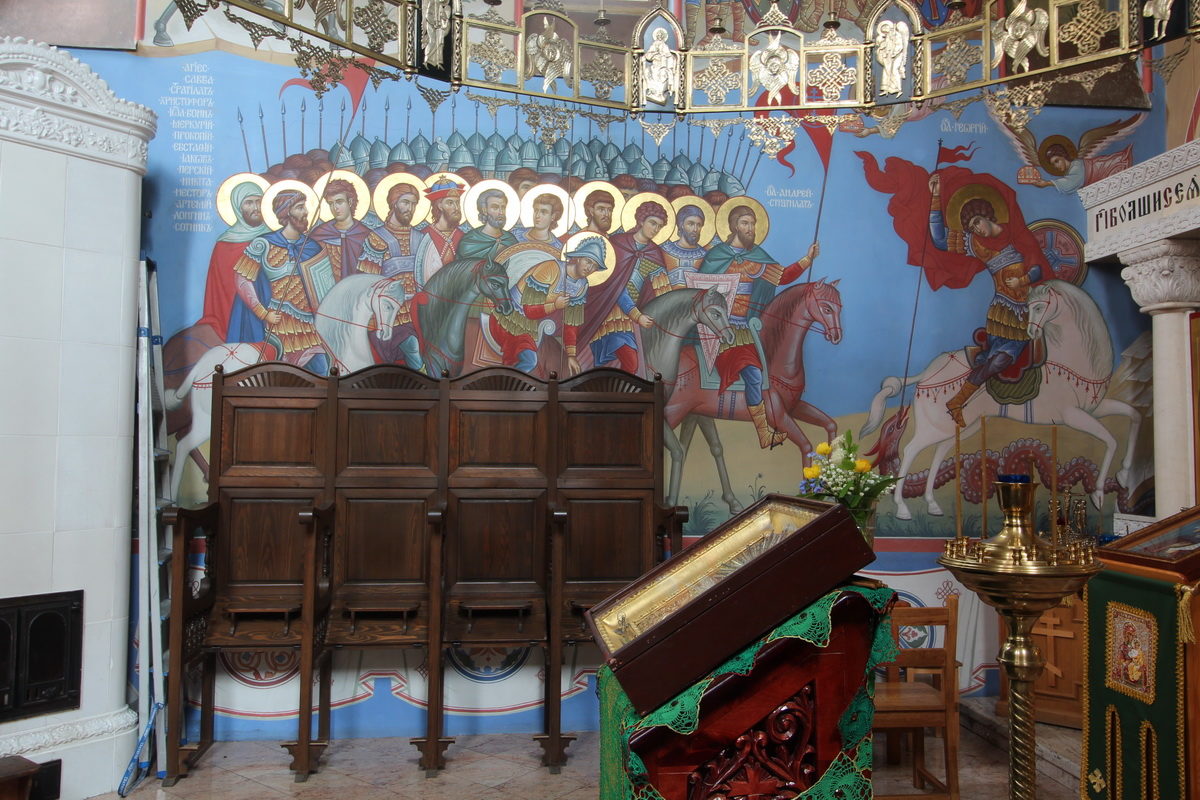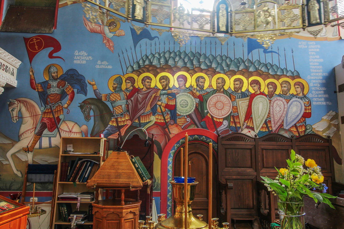 Посмотрим на правую сторону иконостаса, там показано русское воинство под командованием святого благоверного князя Александра Невского, князья воины.