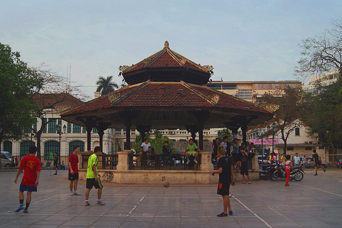 С наступлением темноты Ханой косит под Париж. Все забегаловки превращаются в кафе и обочины до отказа забиваются пластиковыми табуретками и скамейками. Мимо продолжают курсировать мотороллеры, тележки с едой и полиция, которая периодически всех разгоняет, чтобы через секунду после их отъезда все снова заняли свои места.