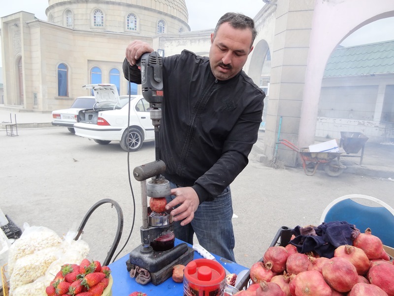 В придорожной кафешке (там, где регулярно останавливаются дальнобойщики, как правило, кормят вкусно) отведали изумительный люля-кебаб и гранатовый сок. А как сок «творили» - о это отдельная песня! Местный умелец приделал к соковыжималке обычную дрель – стакан вкуснейшего сока был готов за минуту.