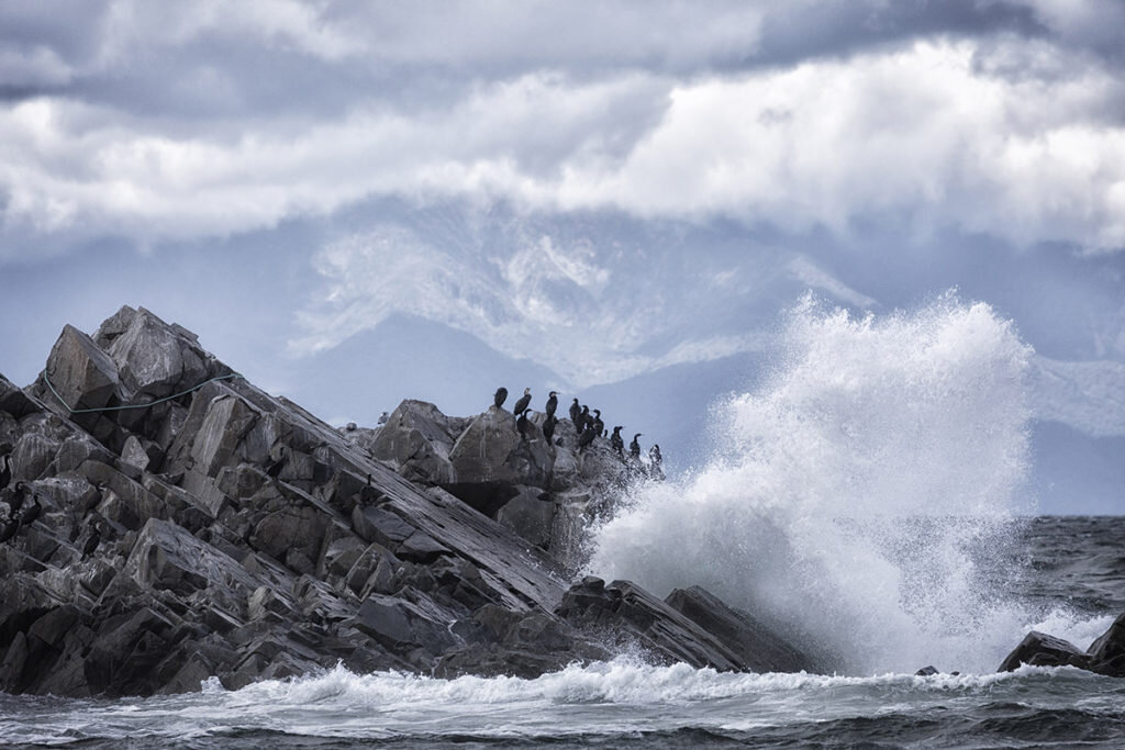 Через Кунаширский пролив, кажется, что совсем-совсем рядом, японский остров Хоккайдо. На скалах, на фоне острова, отдыхают стаи японских и беринговых бакланов. Над головой наматывает круги орлан-белохвост. Под ногами цепочки медвежьих и лисьих следов. Часть их них уже подразмыта волнами, а часть – совсем свежие. На всякий случай раз от раза дудим в гудок, обозначая косолапым наше присутствие.