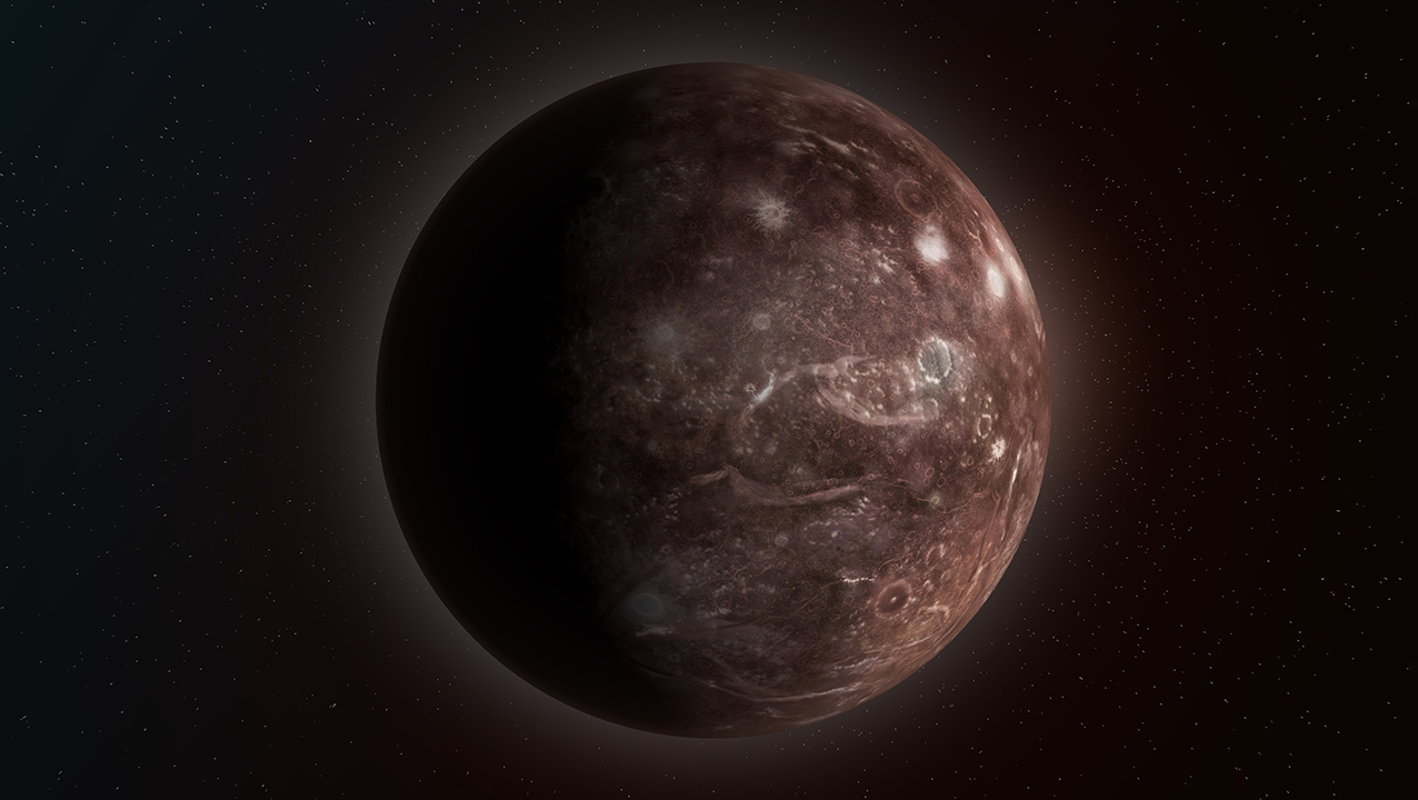 Каллисто — второй по величине спутник Юпитера и третий в нашем рейтинге. Носит имя прекрасной нимфы из древнегреческих мифов, которую Артемида превратила в большую медведицу, а Зевс — в одноименное созвездие. Но эта холодная луна размером почти с Меркурий не блещет красотой: ее поверхность покрыта смесью льда и скальных пород и испещрена кратерами от падения метеоритов. Вокруг них образовались многокольцевые структуры, напоминающие амфитеатры. Самый крупный называется Вальхаллой: от центрального кратера диаметром 600 км расходятся концентрические кольца на расстояние около 2000 км.
