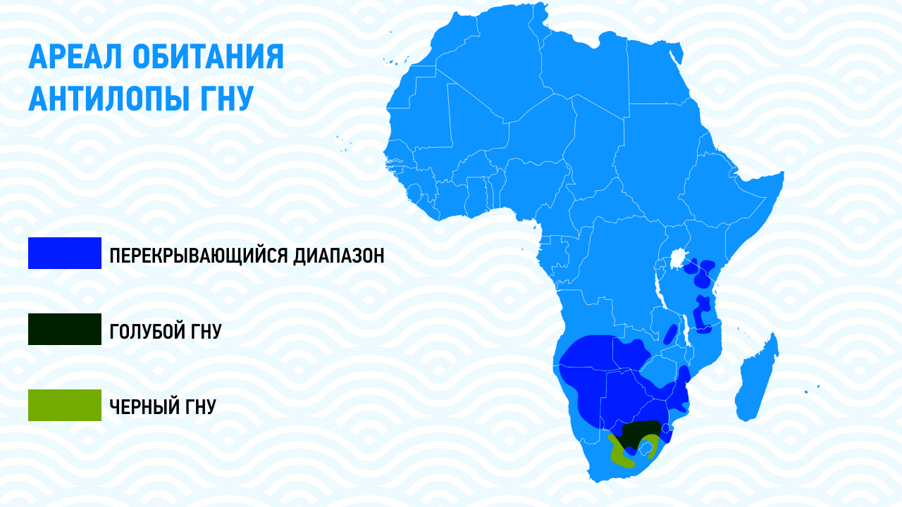 Голубой гну — чемпион по миграциям. Его главная вотчина — экосистема Серенгети-Мара, раскинувшаяся между Танзанией и Кенией. С июля по октябрь эти животные штурмуют реку Мара в Кении, а с наступлением сезона дождей возвращаются на юг, в просторы Серенгети. Но голубые гну живут не только там. Значительные популяции обитают в Замбии, Зимбабве, Ботсване, Намибии, Мозамбике и ЮАР.