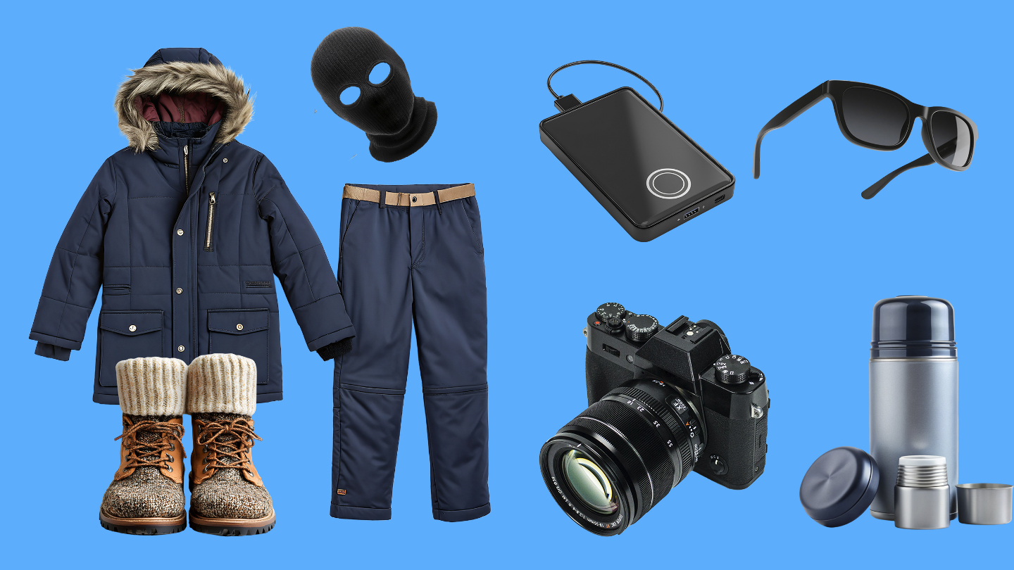 - водонепроницаемые и ветронепродуваемые куртка и штаны, шапка, утепленные перчатки или варежки; -балаклава;
