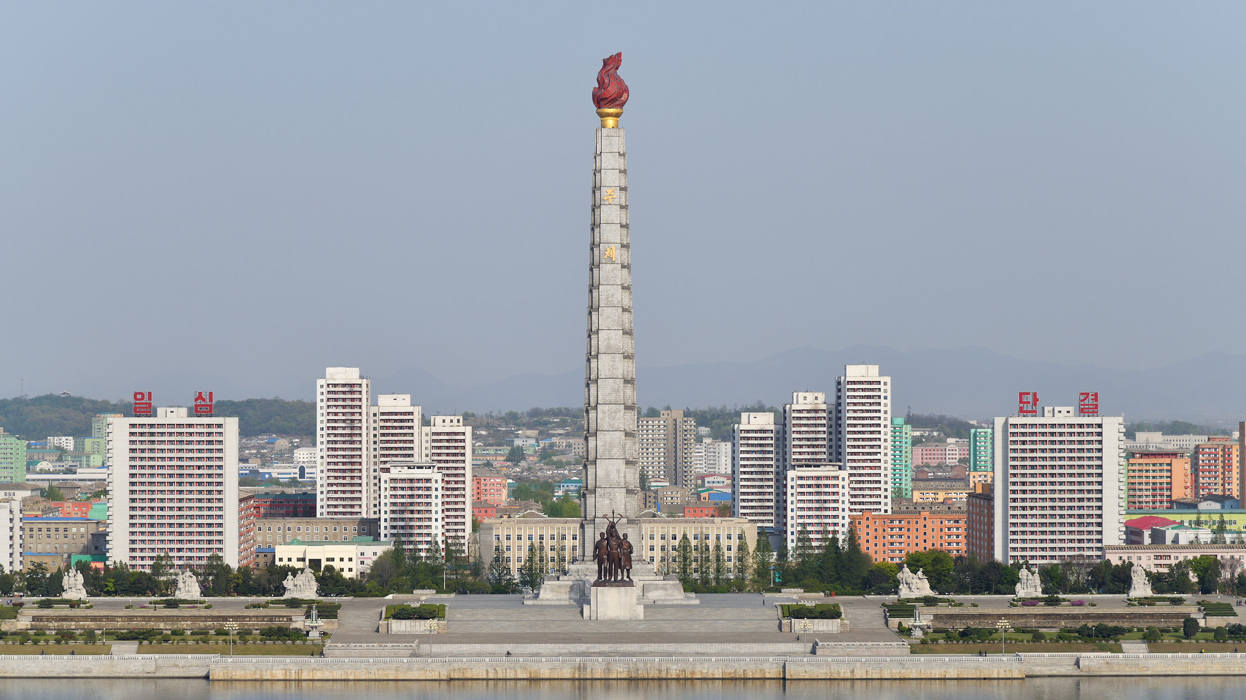 Монумент идей чучхе (философия, подчеркивающая самобытность страны, — прим.ред.) был построен в 1982 году к 70-летию Ким Ир Сена. Имеет высоту 170 м и выполнен из 25 550 гранитных блоков, символизирующих количество дней жизни Ким Ир Сена. Вершину венчает факел, освещаемый по ночам.