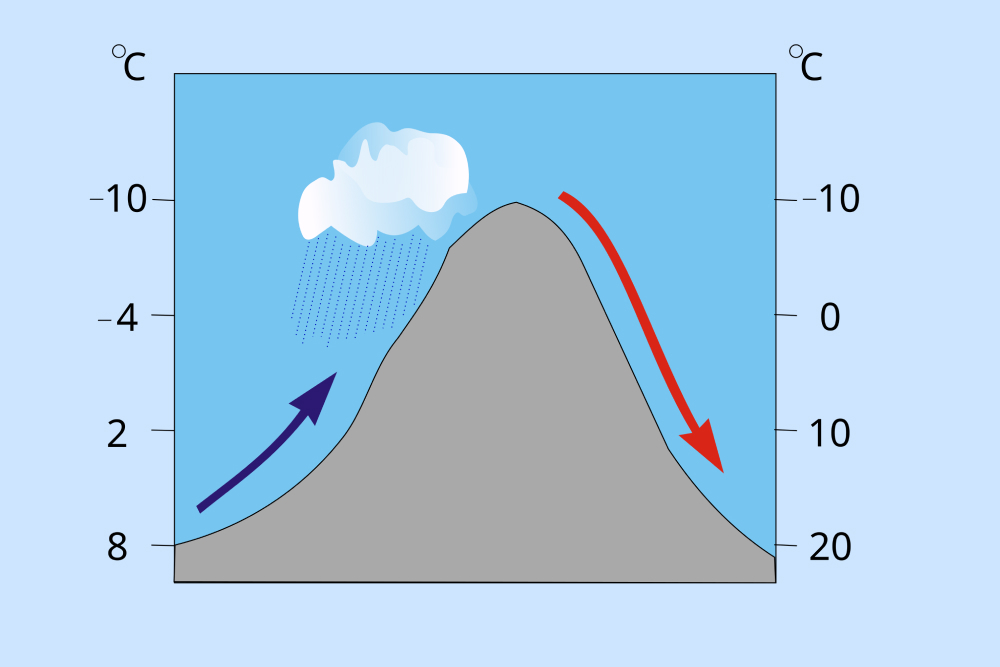 Бывает, что из окна дома виден дождь, а неподалеку стоит ясная солнечная погода. В горах причиной таких отличий может быть эффект фена.