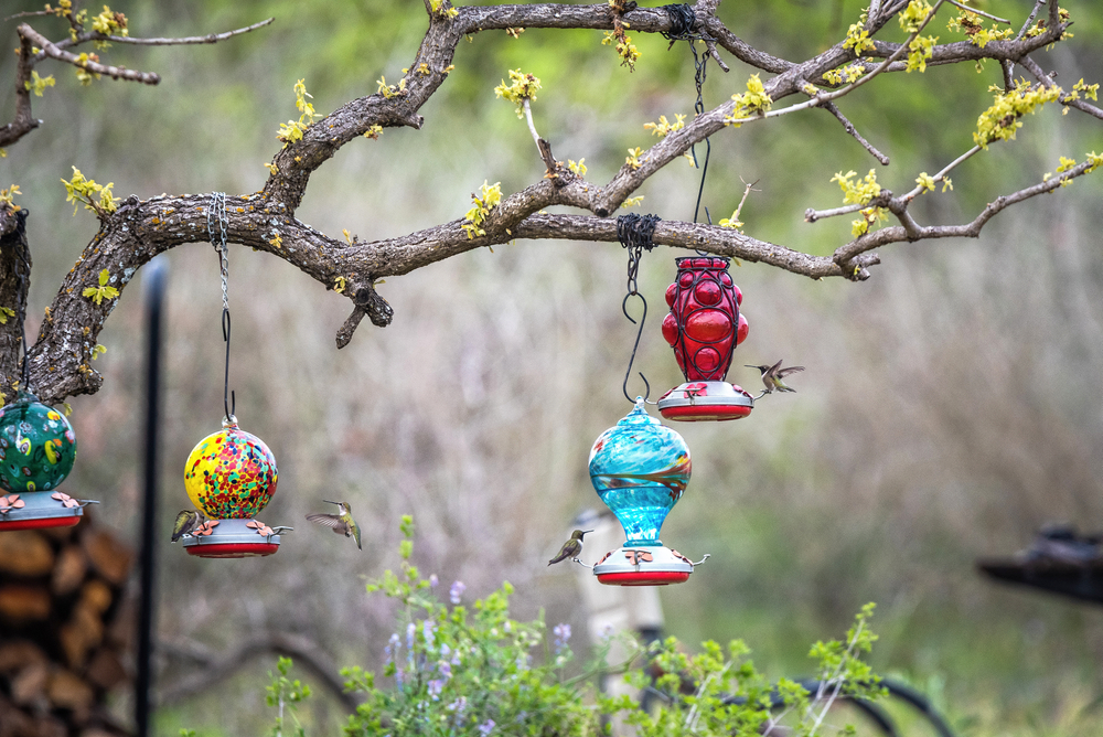 Таковых в саду должно быть много. Иначе колибри будут драться, ведь, несмотря на скромные размеры, они точно так же, как все в животном мире, подчиняются иерархии. Кормушки вывешивают в безопасные места с началом миграции птиц (многие колибри — перелетные).