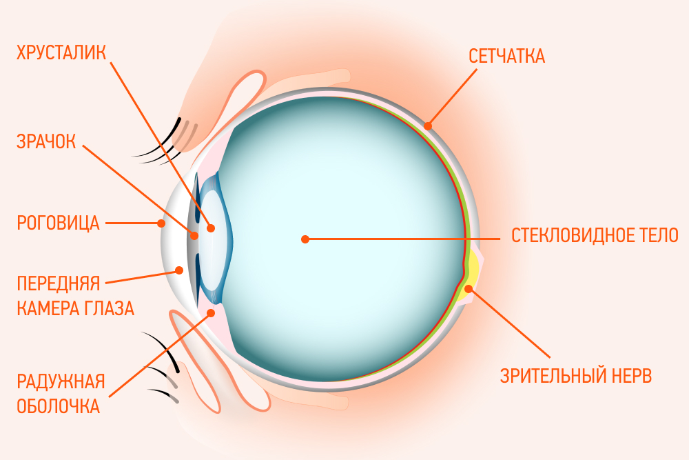 - Хрусталик — область, которая находится за радужной оболочкой, может менять форму для фокусирования света на сетчатке. Хрусталик становится толще, если необходимо рассмотреть объекты, находящиеся вблизи, или тоньше, чтобы рассматривать объекты на расстоянии.