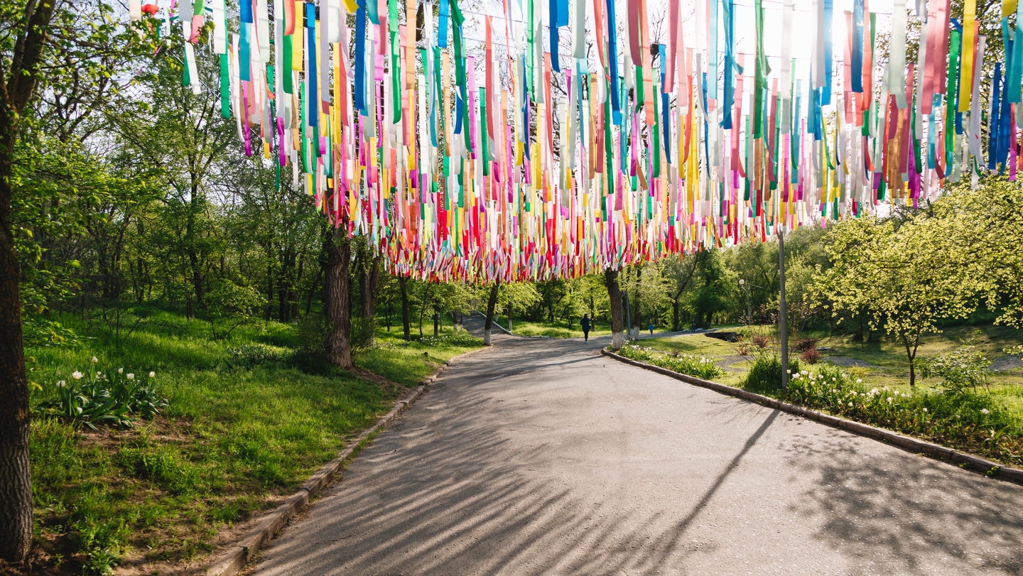 Главная аллея парка — это несколько отрезков очень атмосферного променада, где в ветвях деревьев мелодично позвякивают буддийские бубенцы, за деревьями неожиданно вырастают пагоды, а сами деревья одеты в какие-то невероятно милые кружевные чулочки. На ветру развеваются ленты, крутятся мельницы, и люди вокруг как будто никуда не спешат.